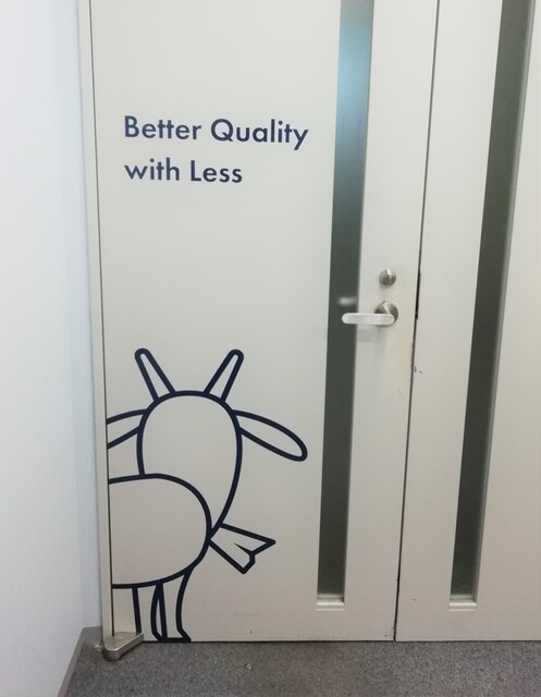 当社執務エリアの入口デザインがリニューアル。入口裏側にはヤギの背中。そして私たちの会社ミッションである「Better Quality with Less」も書かれています。