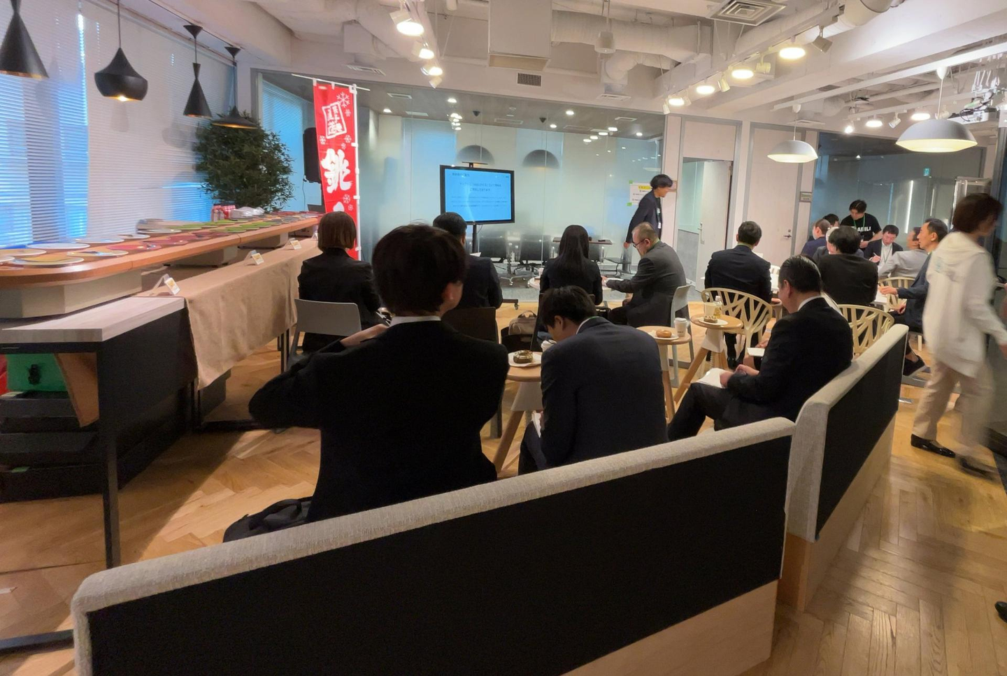 開会は夕方16:30。外食・小売など生活サービス業の経営層や部門責任者の方々、約20名にご参加いただきました。手狭なオフィスのキャパシティギリギリでしたが、皆さまのご協力のおかげでスムーズにスタートを切ることができました。