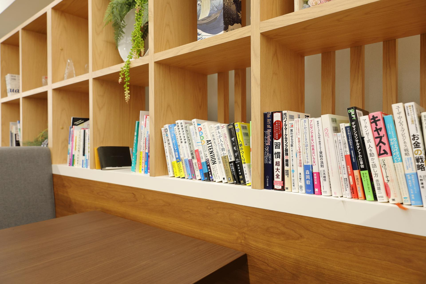 書籍購入制度を活用して購入した本をシェアする本棚も設置。気づきや学びを社内に循環させる仕組みになっています。もちろん、持ち出しも可能です。