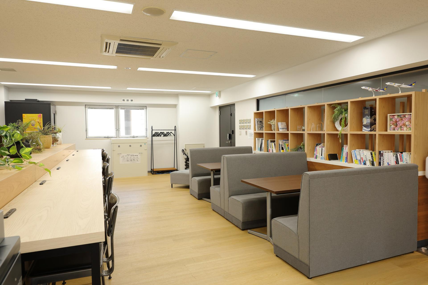 執務エリアに隣接するカフェスペースは、ソファ席や本棚を備えた自由に利用できる開放的な空間。