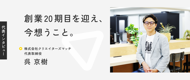 2025年10月、クリエイターズマッチは創業20期目を迎えます。変化の激しい時代の中で、会社を率いる代表はどんな思いを抱き、どのような未来を描いているのでしょうか。これまでの歩みや目指す世界観、会社の方向性について、呉社長に語っていただきました。【プロフィール】呉 京樹:代表取締役社長。デジタルハリウッド卒業後、ゲーム会社や映像制作会社でデザイナーとして活躍。その後、ソフトバンク・ヒューマンキャピタルに入社し、営業マネージャーを務める。2006年に独立しWeb制作会社を創業。オンライン広告の拡大を見据えて2007年に株式会社クリエイターズマッチを設立。クリエイターが輝ける社会の実現に挑ん...