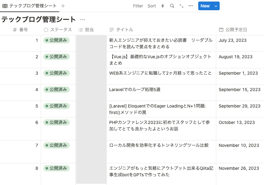 Notionでテックブログ管理シートというものを作成し、こちらで管理しています。