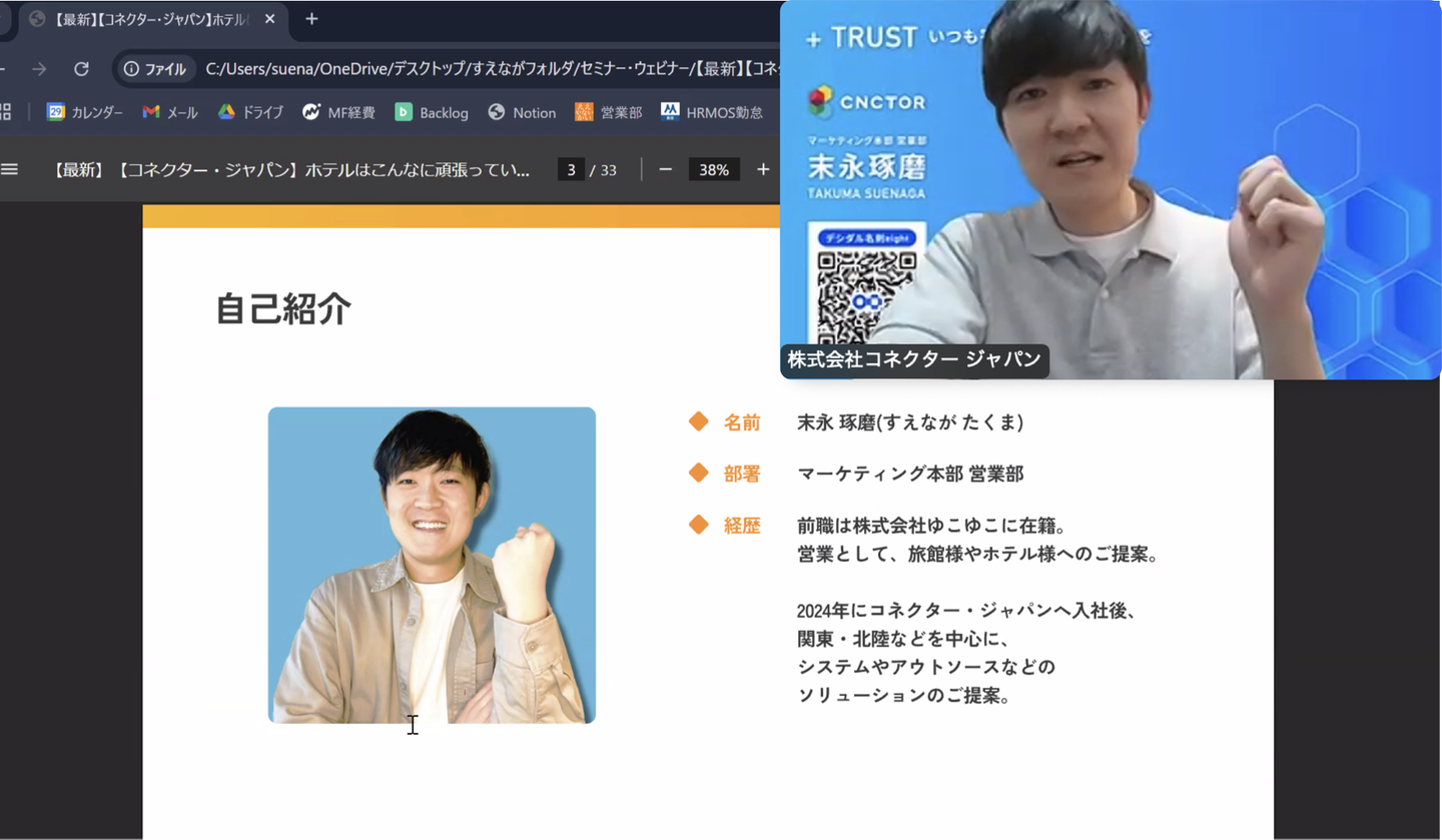 宿泊業界の口コミ課題に向き合い、セミナーで自らマイクを握った営業部・末永さん。