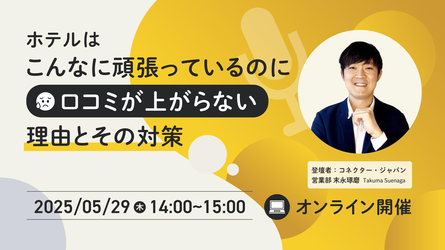 今回のセミナーでは、「宿泊施設が抱える“クチコミ課題”をどう乗り越えるか?」をテーマに、 口コミが伸び悩む原因と、明日から実践できる具体的な解決策をお伝えしました。 これまでに2,000施設以上を支援してきた知見をもとに、「なぜ今、口コミなのか」「どうやって改善していくか」にフォーカスし、現場の努力が報われるためのヒントをお届けしました。