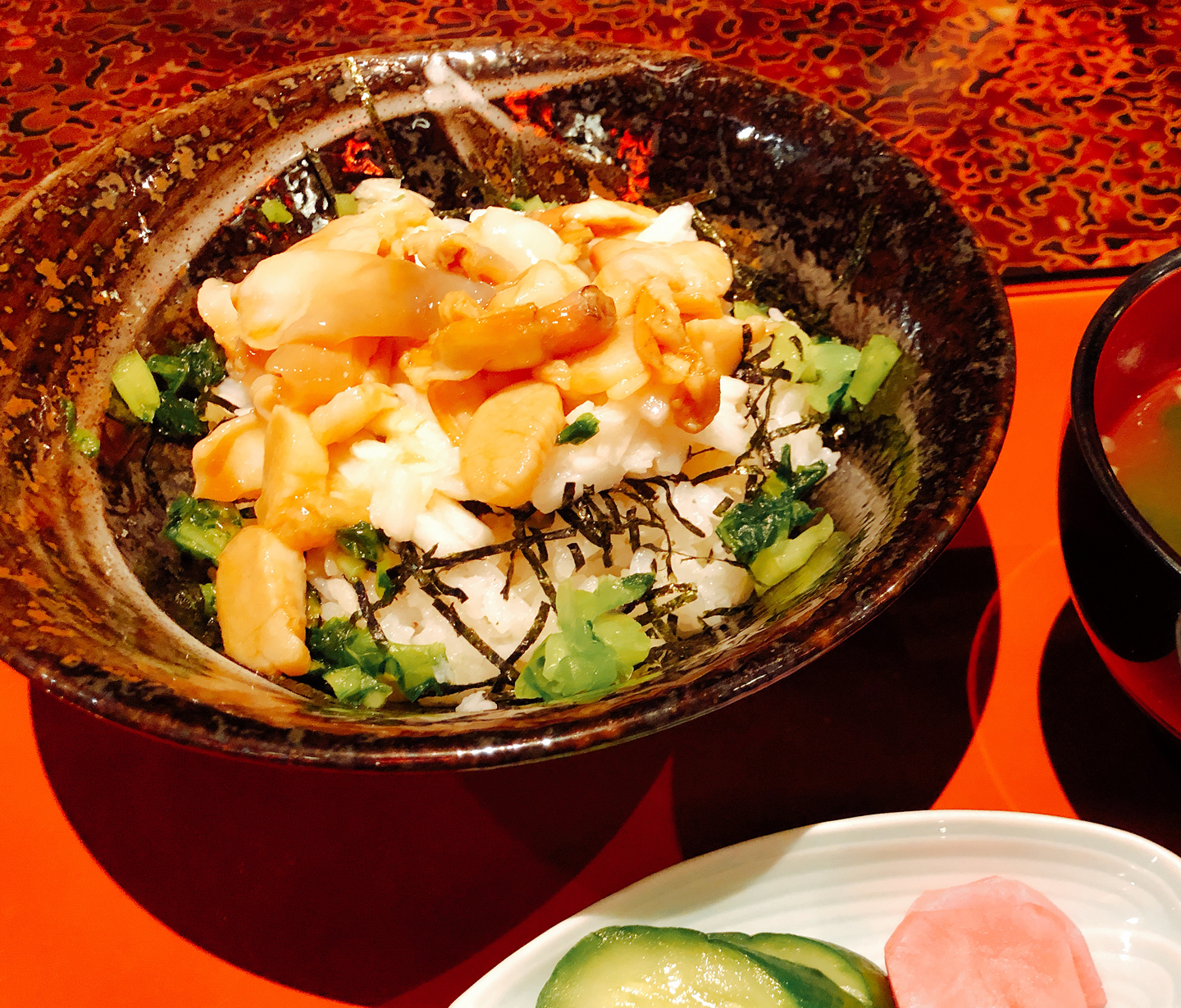 青森といえばりんごということで、シードルをまずは楽しみます。生ホッキ貝と山芋を加えた丼を豪快にかけこみます。これがうまい!それもそのはず。実はホッキ貝の旬は地域によって違うんです。