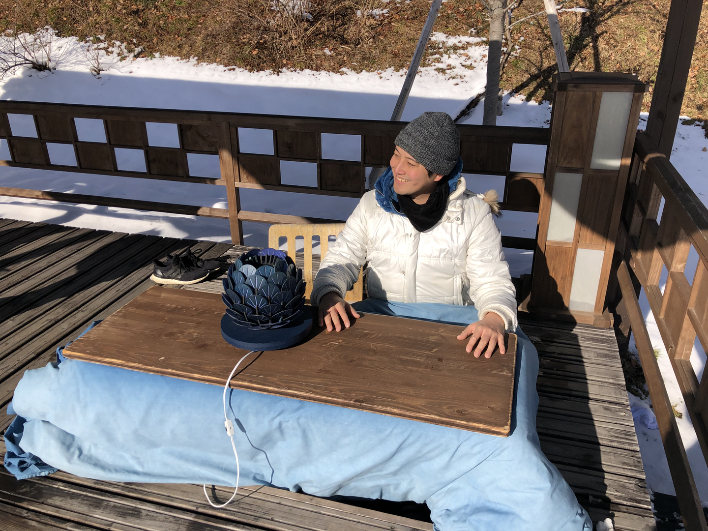 青森の湖面は凍っています。ですが、なんと外にコタツが設置してありました。凛とした寒さの中でコタツに入ると、頭がシャキッとして、体はポカポカ!
