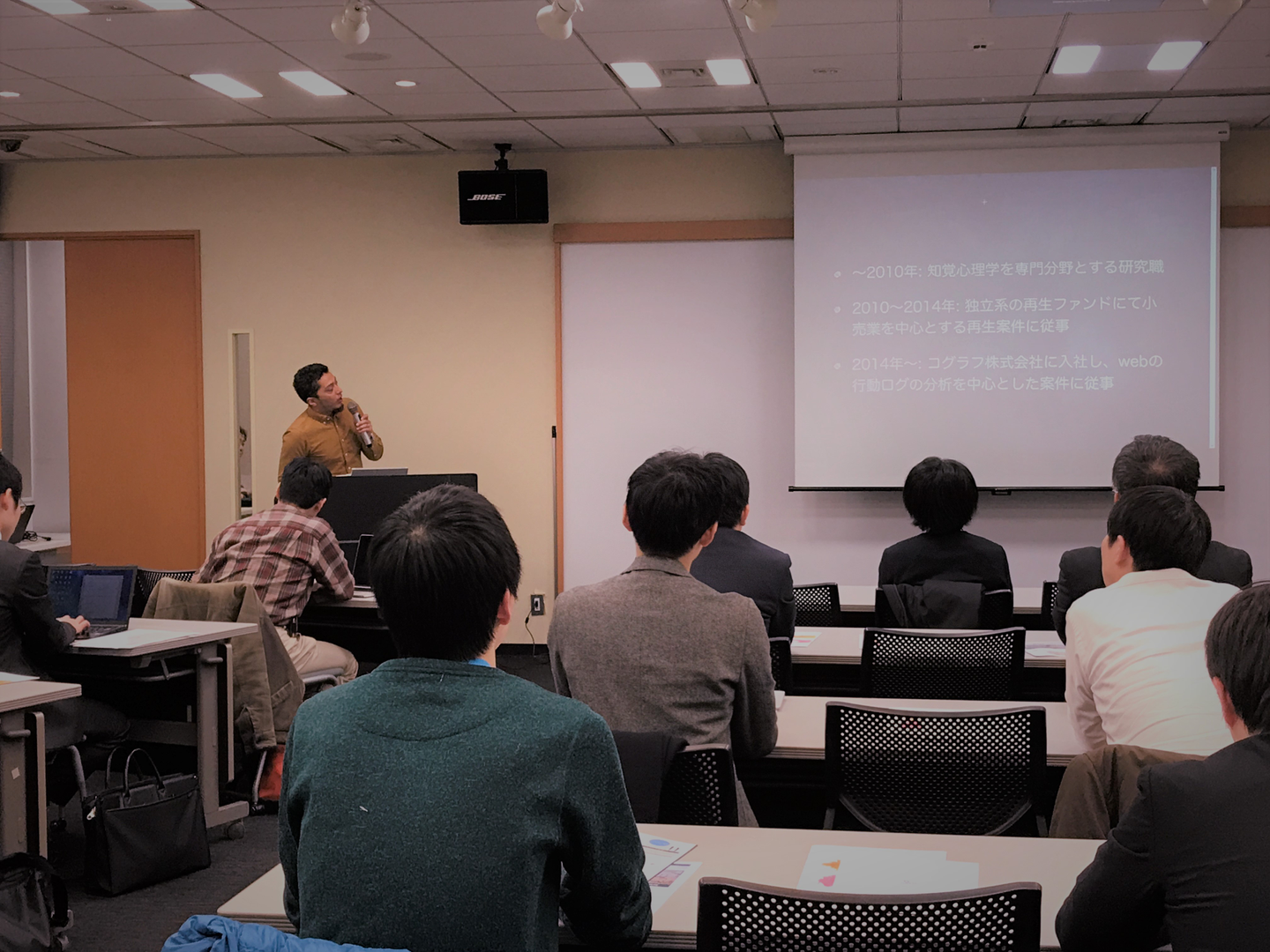 本郷は、知覚心理学の研究職(博士号取得)→再生ファンドで企業の再生案件に従事→現在、弊社でWEBの行動ログの分析に従事という少し変わった経歴の持ち主です。