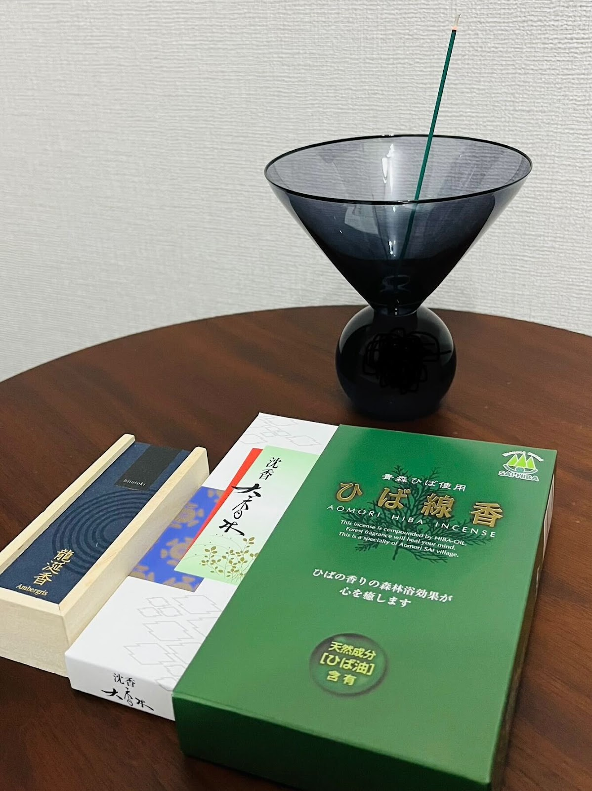 青森旅行で購入したヒバ(ヒノキ科の針葉樹)のお香を焚いて寝たところ、すごくよく眠れたのをきっかけに、日中もリラックスしたいときに使うようになりました。気持ちが落ち着き、前向きになるのでとても気に入っています。画像にある、青森ヒバ、沈香(じんこう/Agarwood)、龍涎香(りゅうぜんこう/Ambergris)が特にお気に入りです。