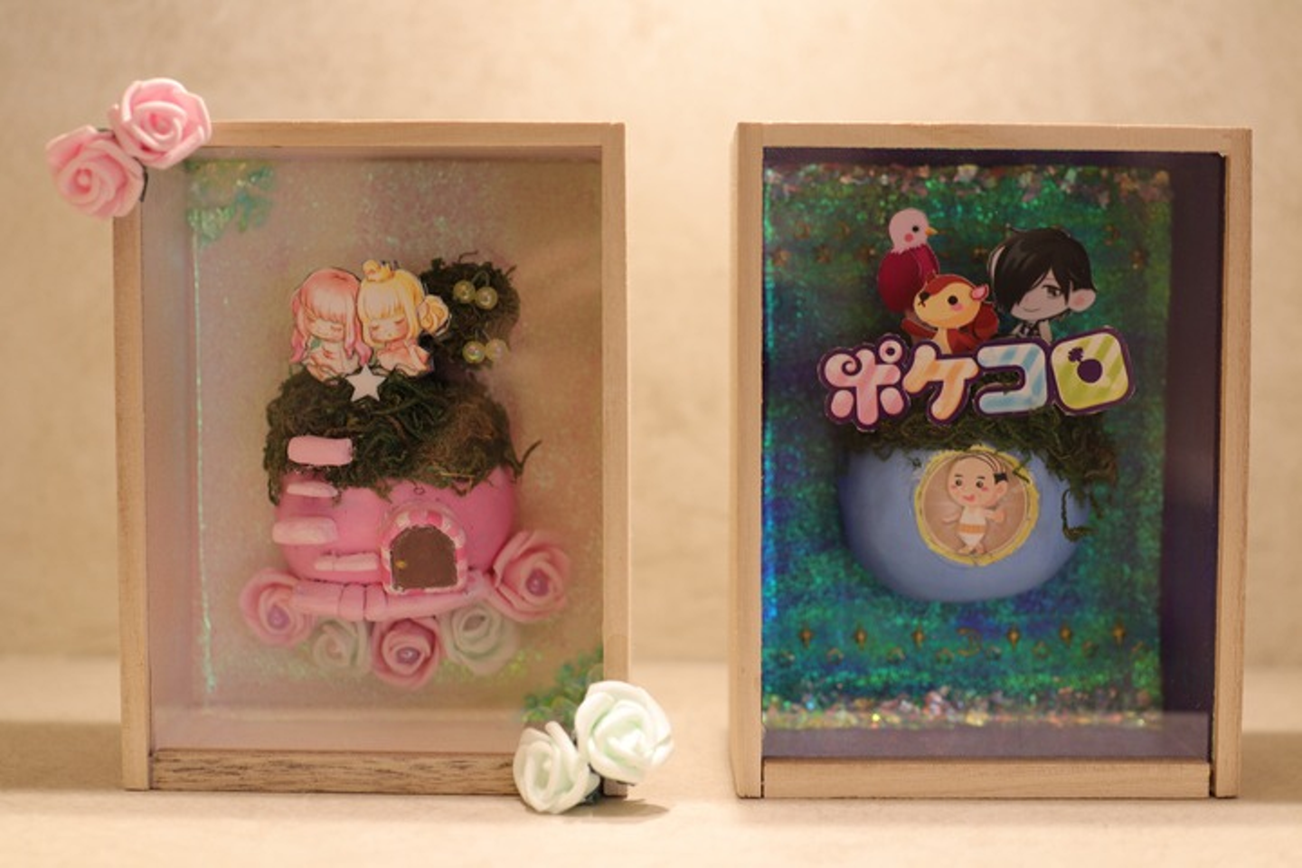 こちらはかわいらしいポケコロのシャドーボックス。これ、なんとお客様が作って下さったものなんだそうです!立体的で繊細ですごい……!!