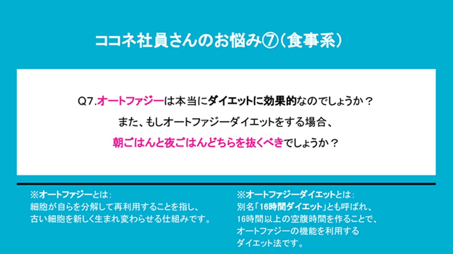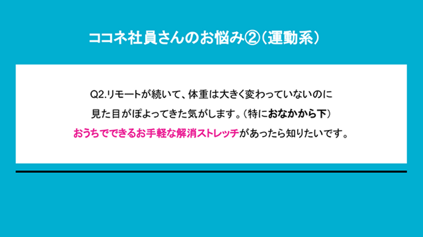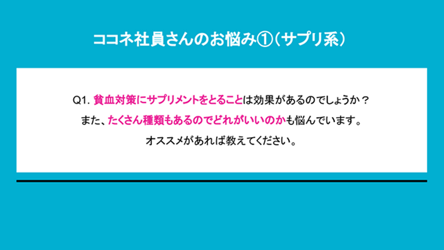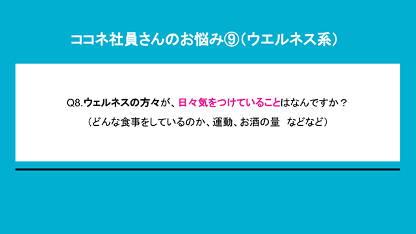 また、後半にはココネ社員さんから募集した健康についての質問にお答えします。