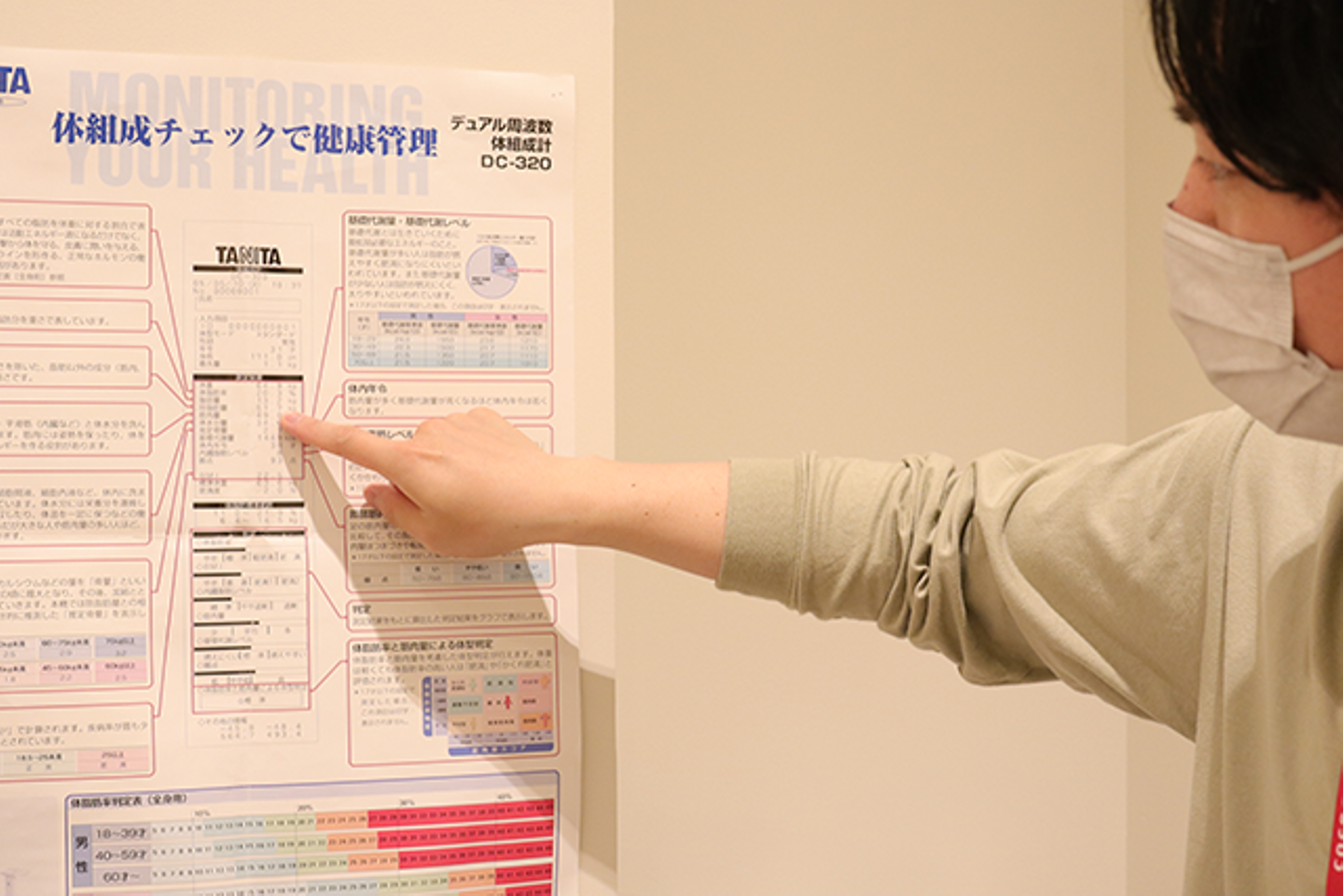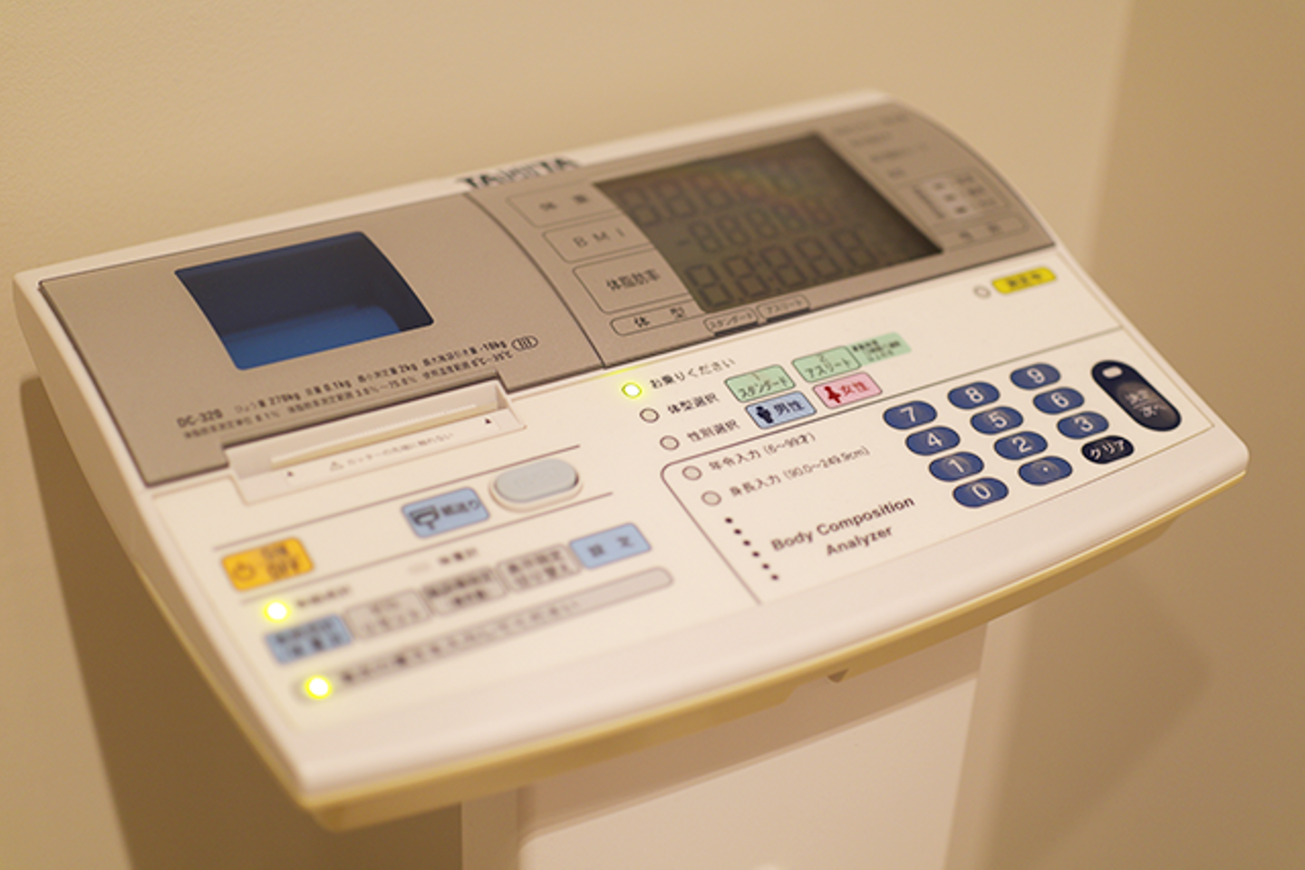 カウンセリングではこちらの体組成計という機械を使って体の様子を見たり、器具の説明やトレーニングを見ていただいたり、体の不調などの相談をします。