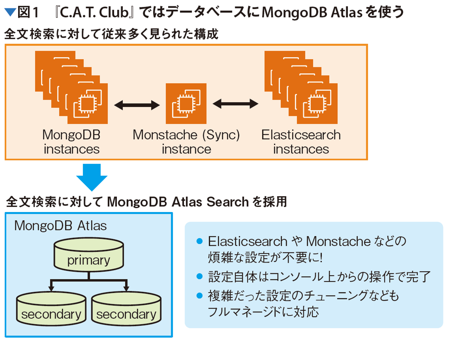辛 実はAtlasなら検索においても有利です。これまでMongoDBを使用していたアプリでは、ユーザーやアイテムでマルチバイト検索をするときにパフォーマンスの問題があり、Elasticsearchにつなげていました(図1)。