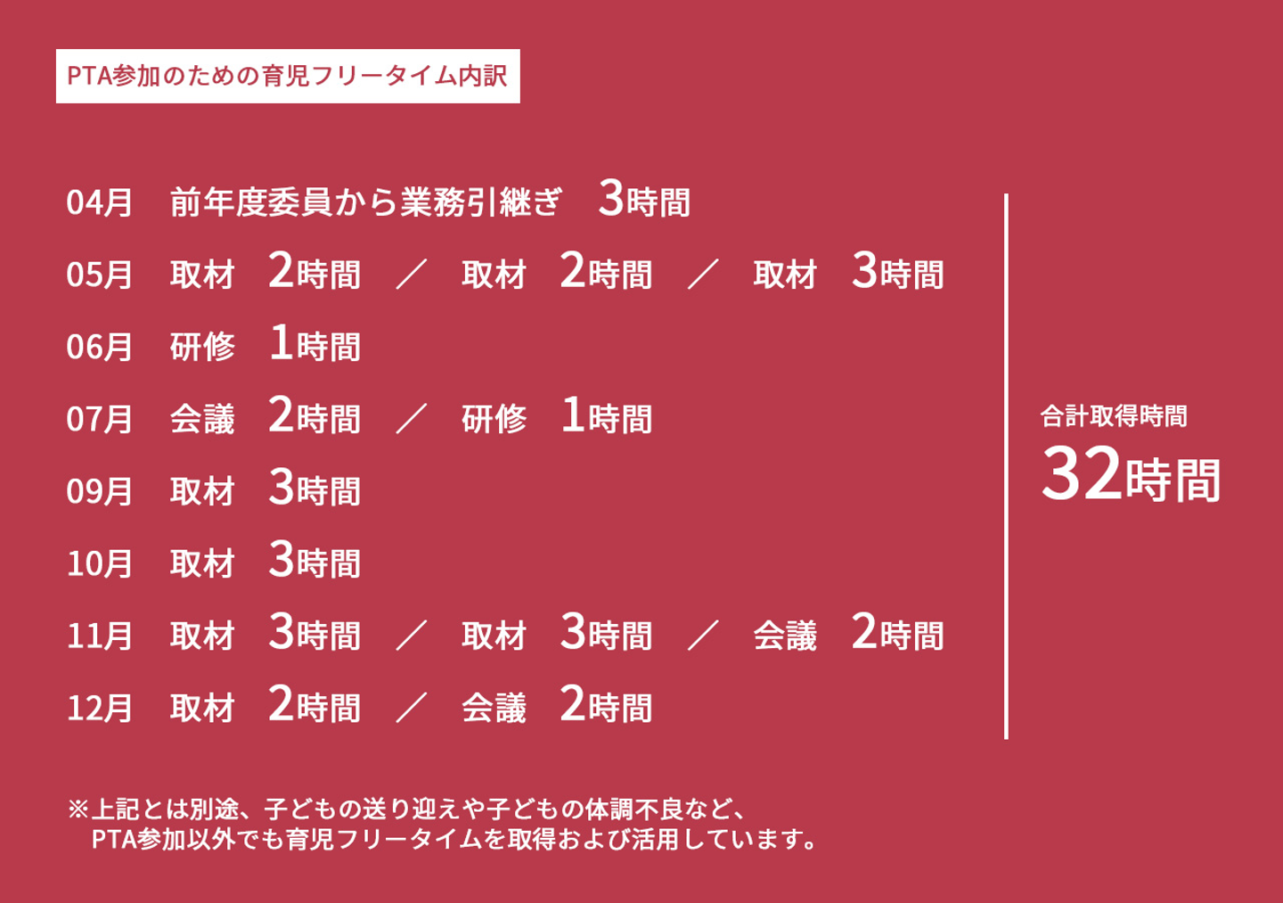 4月から12月まで合計32時間、育児フリータイムを利用しました。ひと月当たり約3.5時間です。PTAでの活動は学校の開校時間に合わせた平日午前中に行われることが殆どでしたが、会社で対応する業務によっては一度出社してから学校を訪れたり、午後から出社したりするなど、柔軟に利用できる本制度をフルに活用しました。