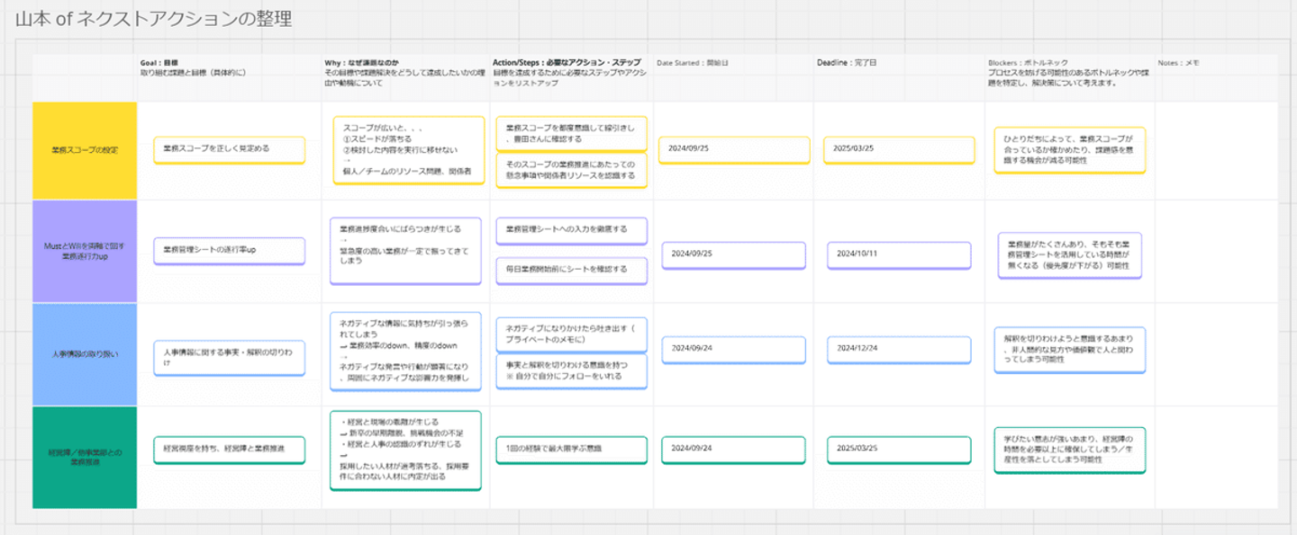 上記振り返りワークを踏まえて、研修の後半パートでは『目標設定ワーク』を行いました。課題のそれぞれに対して、目標設定の5つのポイントの頭文字を取ったビジネス用語「SMART」を意識して、以下6つの項目から即実行につながる具体的な目標設定をすることができました!