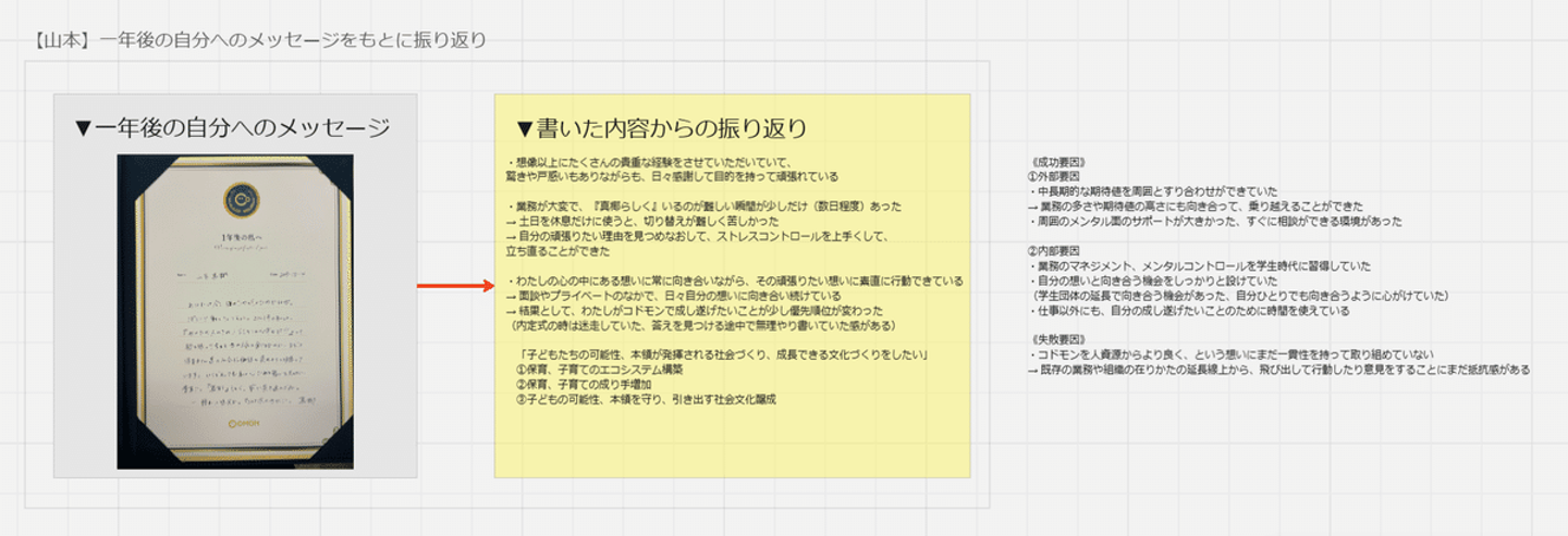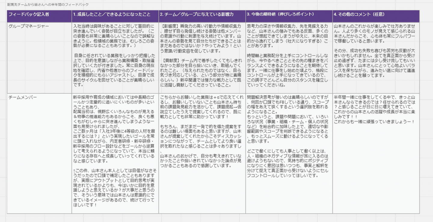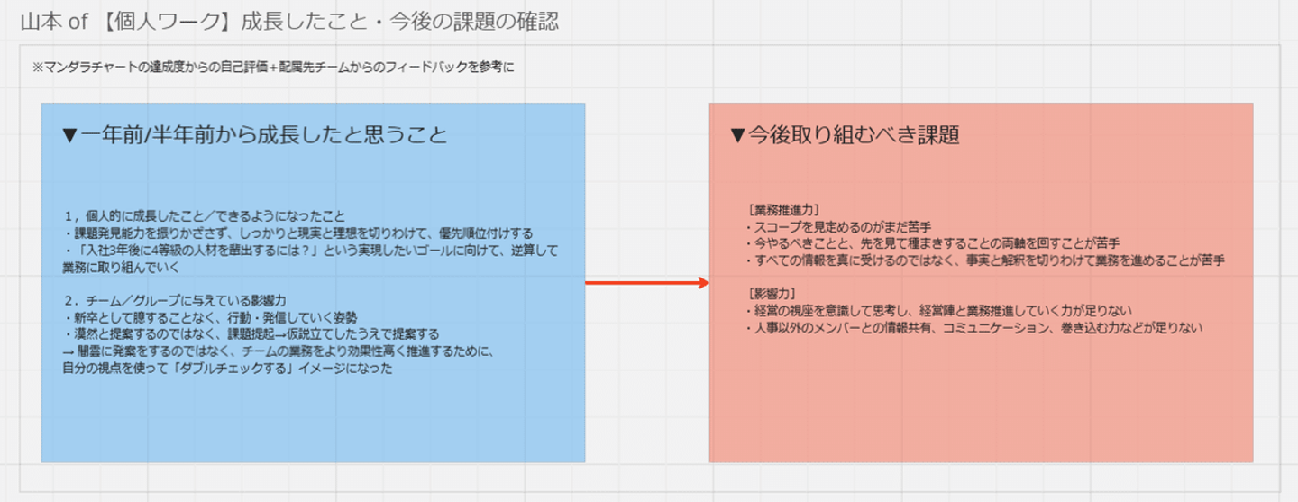 そのうえで、各新卒配属先のマネージャーやチームメンバーから事前に集めていたフィードバックを受け取り、客観的な視点を踏まえた振り返りとして「半年前から成長したと思うこと」「今後取り組んでいきたい課題」を整理していきました。