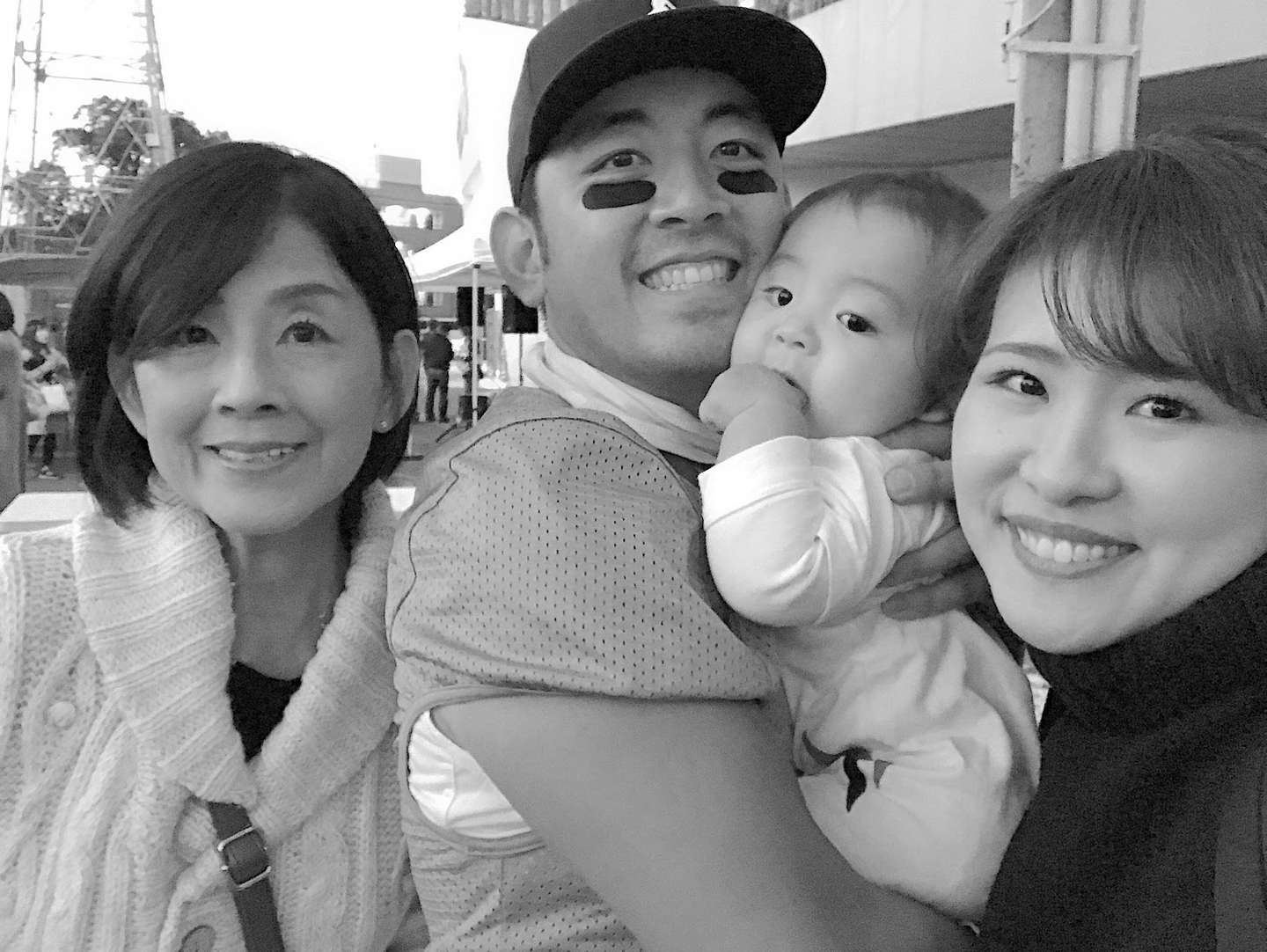 ※あまりに奥様が登場するので、フットボールの試合終了後の思い出写真をもらっちゃいました。奥さん美人さん!お子さん、指食べてる〜(笑)。そして、左は藤本さんのお母さま。とっても幸せそうですね。