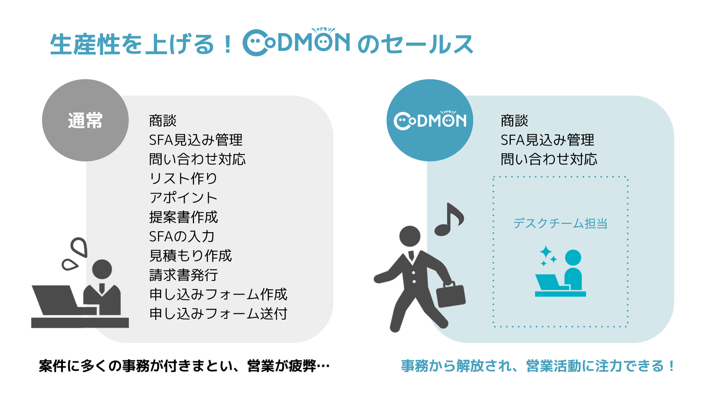実際に園に訪問して商談をする役割なので、主には変わらずです。変わったことはマーケティング担当の今井くんが集めるリード(園から来るインバウンド)には手をつけずに、今までコドモンを使ってくれた園の紹介と代理店からの紹介のみで、顧客開拓をするという点です。