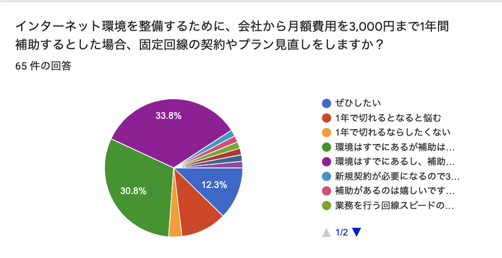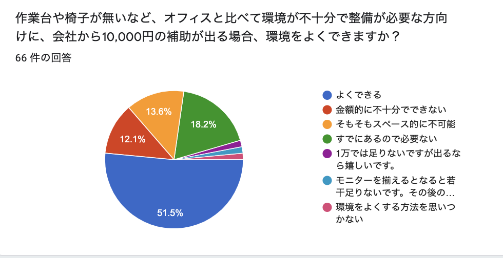 当初10,000円くらいの補助でどうかと思い、自宅の環境やパフォーマンスについてもアンケートを行ったのですが、「同等のパフォーマンスを目指して環境を整える」となるとなかなか厳しそうだなというのが結果でした。