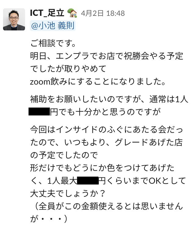 環境は整備できたとしても、コミュニケーションが減ることはどうしても課題として残ってしまうので「リモート飲み会」を支援し始めました。元々、達成会をする予定だったのに、自粛となってしまってできなくなったICT推進チームから声があがり、リモート飲み会で購入したお酒や食べ物を経費精算できるようにしています。