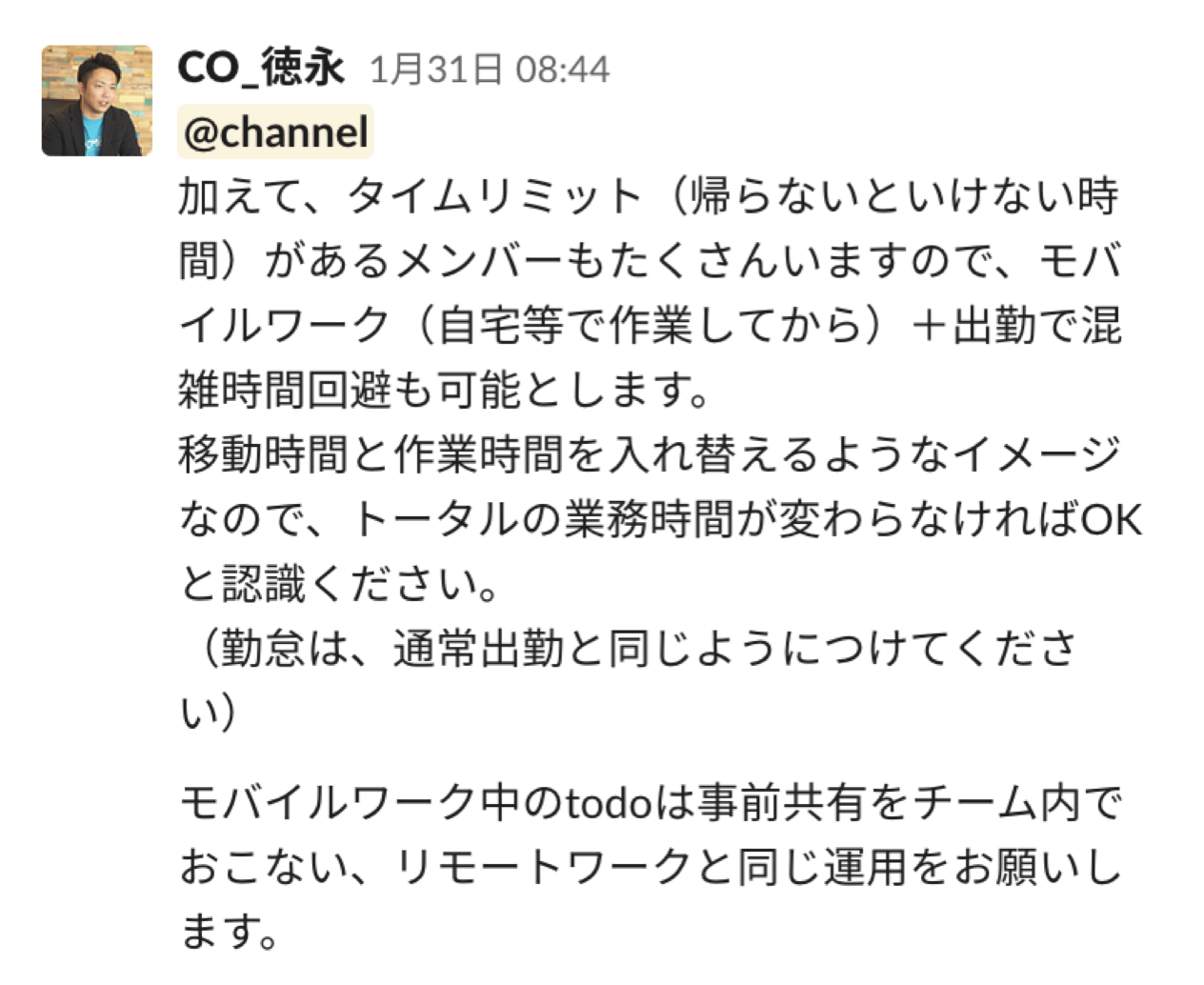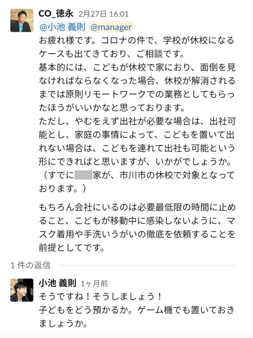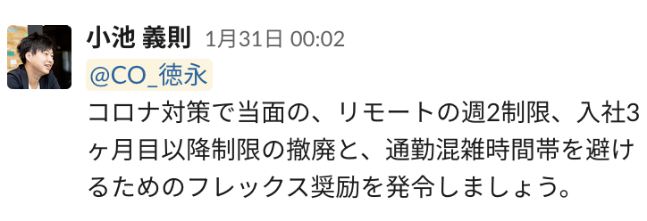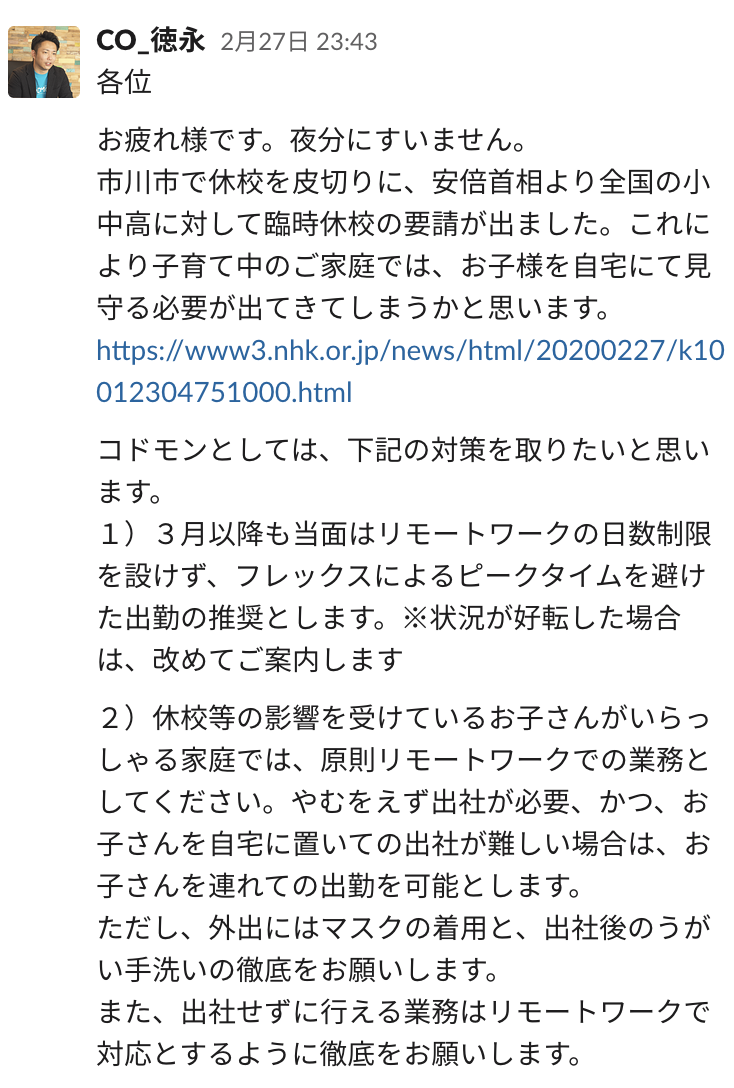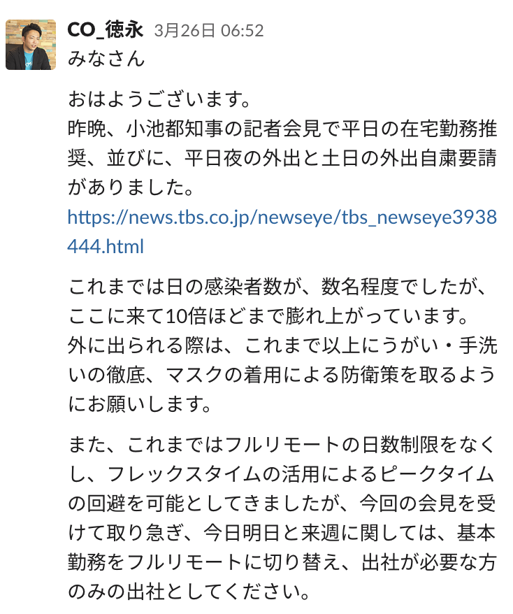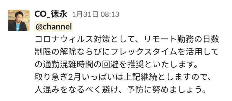 中国で、爆発的に感染が拡大し、感染者数が10,000人ほどになる頃、日本はまだ100人にも満たない(※)中で、代表の小池から経営メンバーのSlackチャンネルで指示がありました。