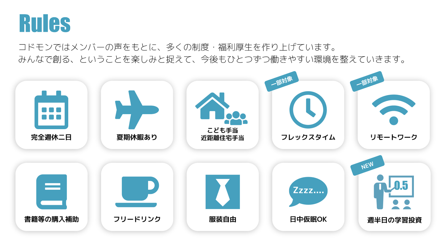 定時は9:00 - 18:00です。残業も多いというほどではなく、20時くらいにはほぼオフィスに人がいなくなります。子育て世帯も多いため、送り迎えでの時間差が必要であったり、早く帰らなければいけないメンバーもいます。一方でサポート窓口の受付時間が9:00 - 19:00であることから、サポートチームではシフト勤務をしていたりもします。さらに、セールスメンバーは訪問・出張も多いため、直行直帰や合間時間のモバイルワークを行っていました。