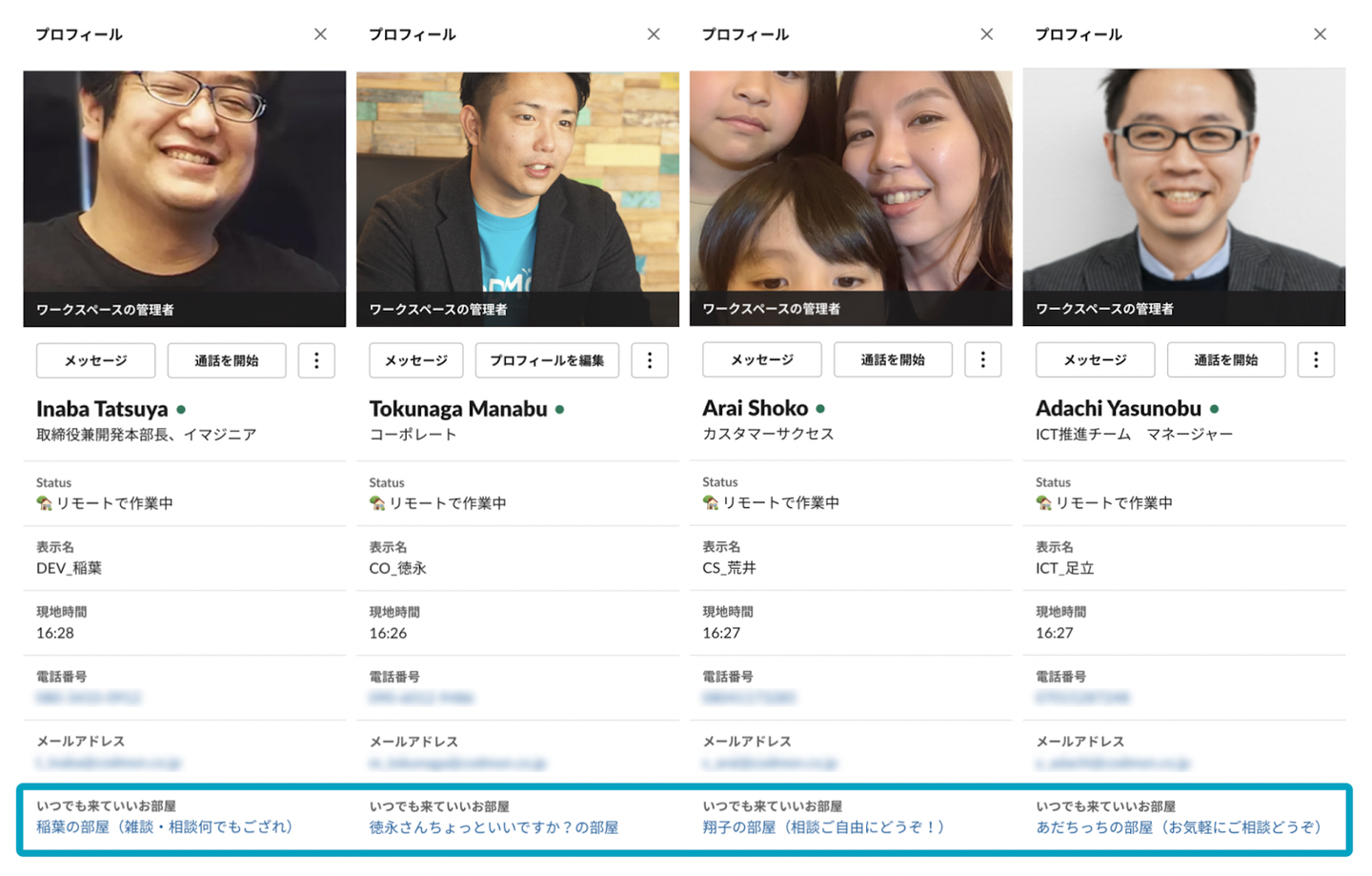 フルリモートになると業務には集中できるものの、コミュニケーション量は減ります。特に、Face to Faceの時間は減りますし、気軽に確認・質問ができないという点は大きな課題でした。Slackのプロフィールに記載するようにして、アクセスしやすくしてからは訪問の頻度があがりました。