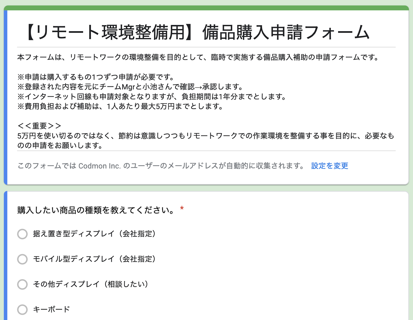 めちゃくちゃ儲かっている会社なら何も問題ありませんが、僕らはまだまだ小さなベンチャー企業。もちろん何でもかんでも叶えてあげられるわけではないのですが、会社として出社を止めてもらっている以上、何かしらの支援をする必要があると考え、最大5万円までとして環境整備の支援をすることに決めました。