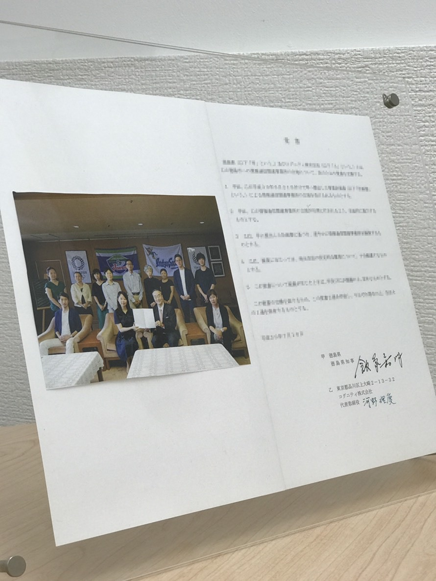 そして、オフィスは今年の7月に新設したばかりです!徳島県庁にて徳島拠点設立に関する覚書調印式も行い、雇用の可能性が拡大しました。本社でもその時を記念して写真と共に覚書が飾られています。