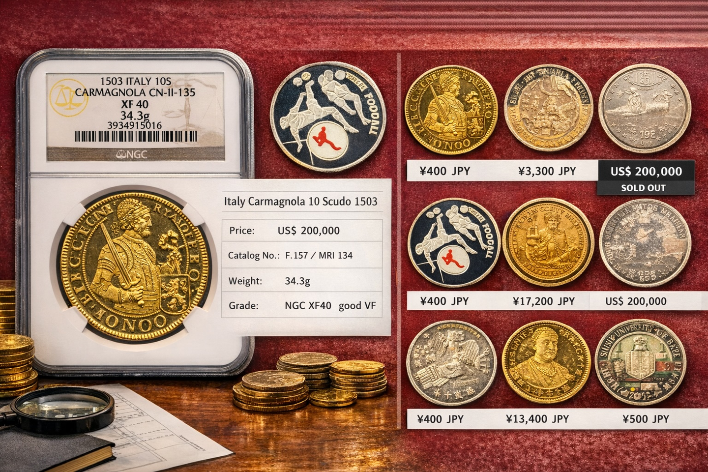数百円のコインから、数百万円、時には1,000万円を超える歴史的コインや美術品です。