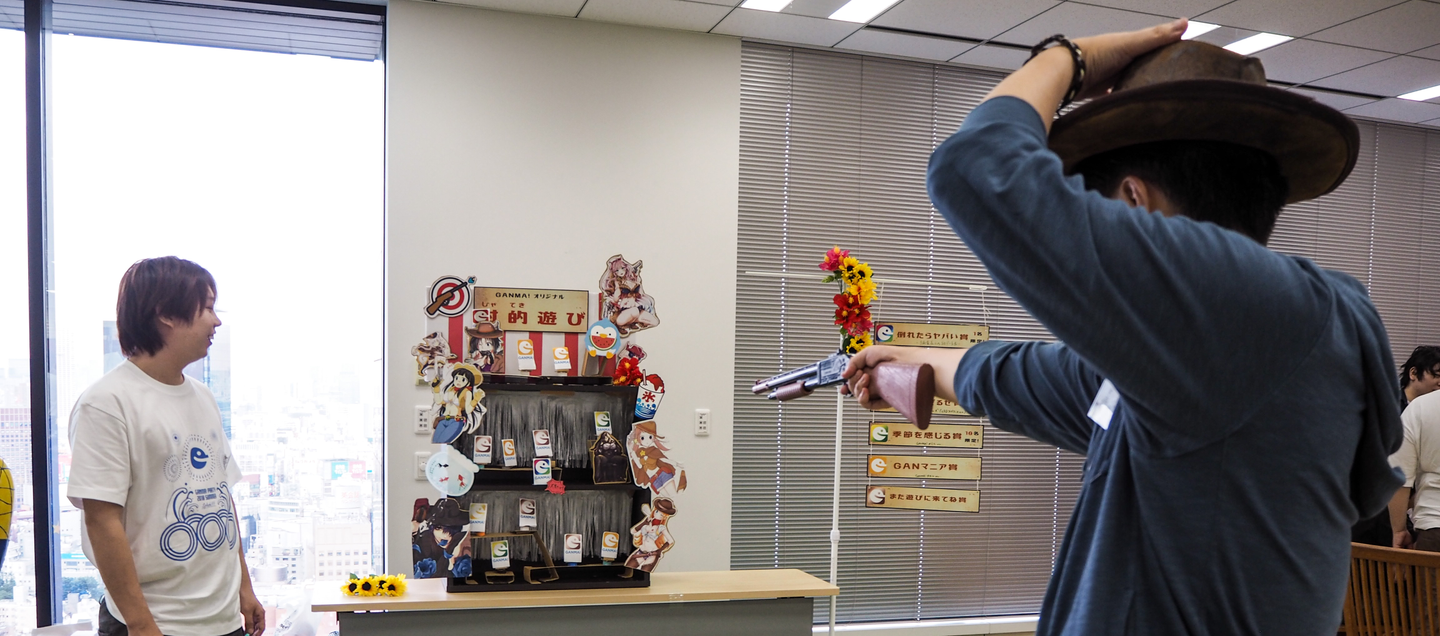 的に当たったら景品をプレゼント!しかしそう簡単にはいきません。的には『倒れたらヤバい賞』『ナイススナイパー賞』『GANマニア賞』など難易度の異なる様々な賞が記載されており、それぞれ美容グッズやGANMA!グッズなどの景品をご用意。カウボーイ風の帽子にコルクガンが似合っています!