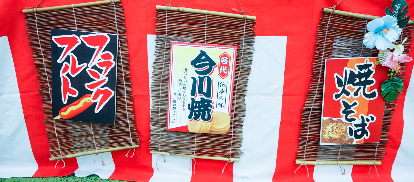 遊んだ後は、料理でおもてなしです。お食事も屋台風に統一しました。夏らしいメニュー表も、文字やデザインなど、クリエイティブ職の社員がこだわって制作しました。