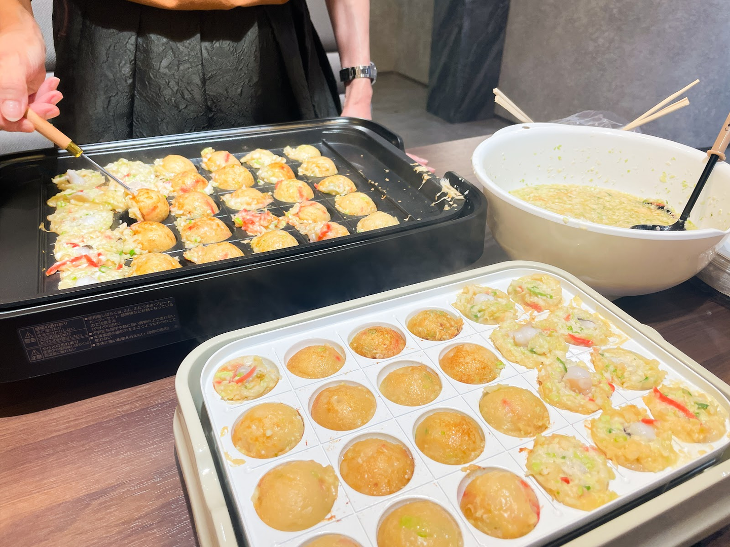 「焦げてない?(笑)」「タコ無しが一番おいしいかも(笑)」など自然に会話が生まれ、 気づけば焼いては食べて、みんな夢中に。