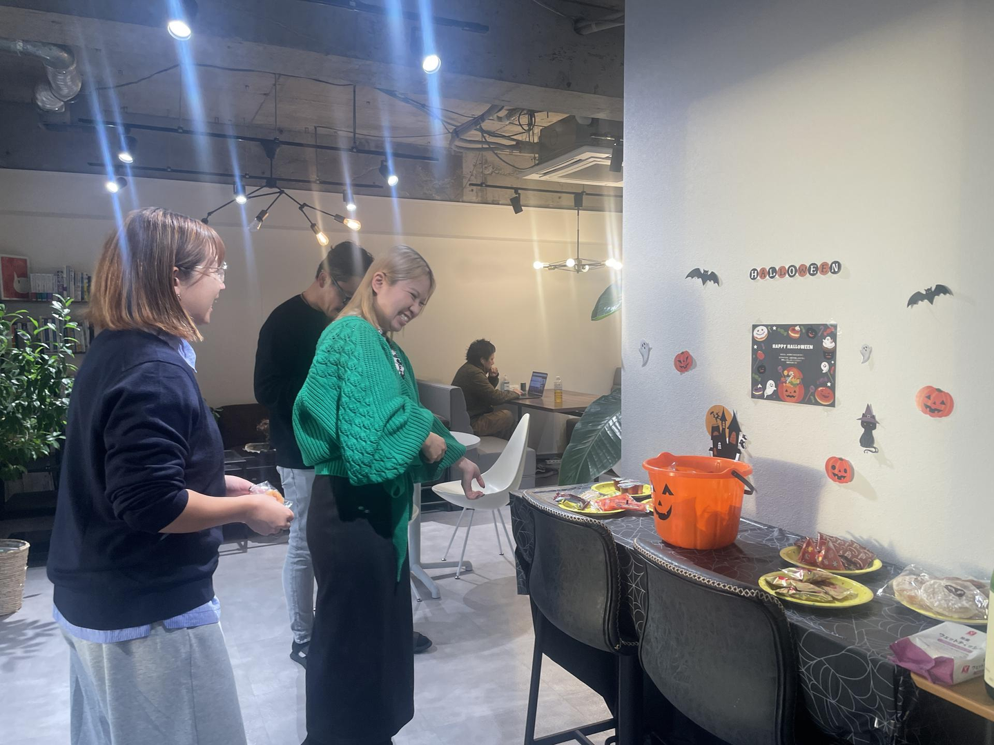 設置初日、カフェテリアに「ハロウィンコーナーができました!」と社内チャットで呼びかけたところ、早速次々とメンバーが集まる姿が!