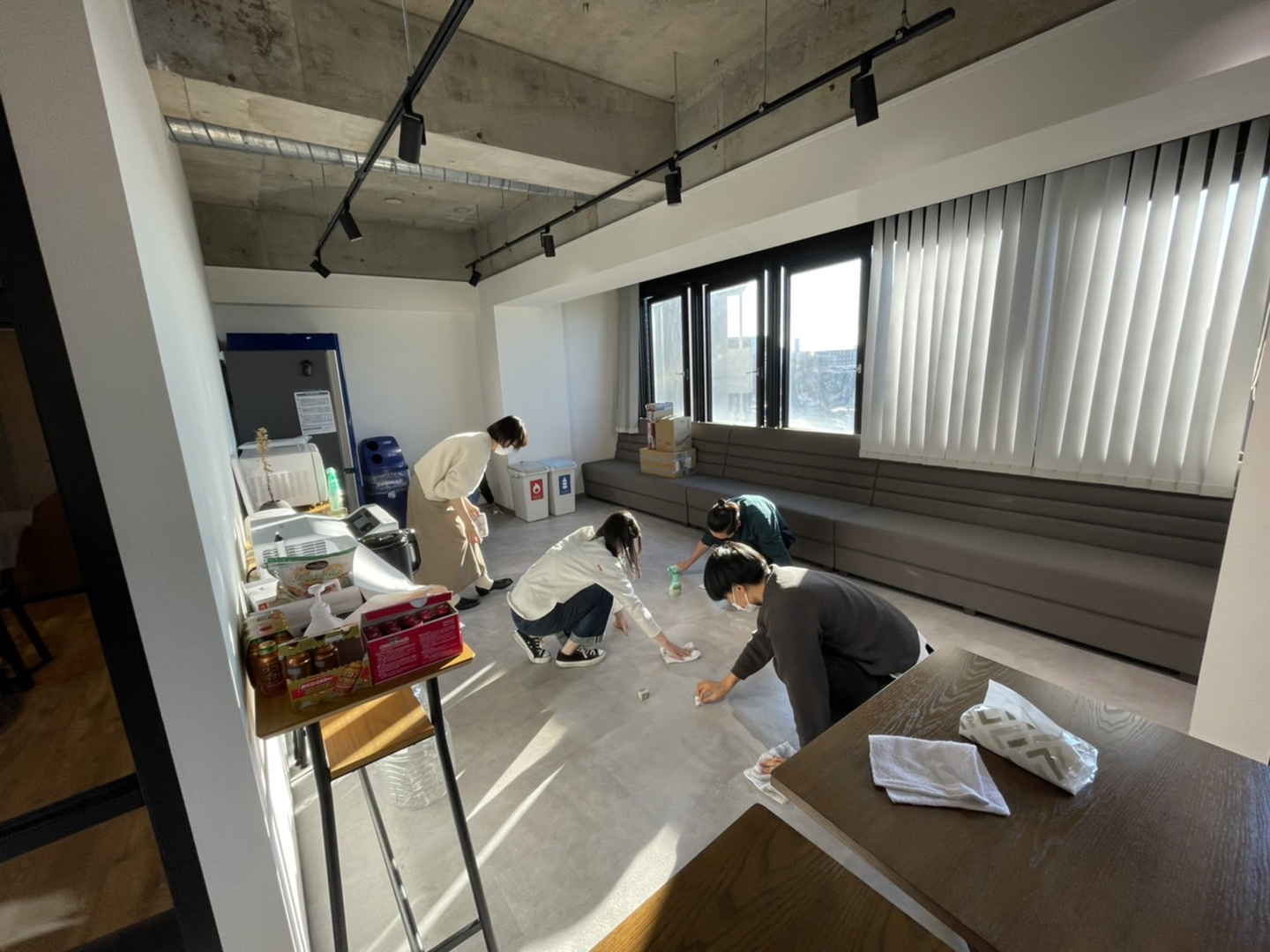 昼休みにはお昼ご飯を食べたり、ミーティングをする使用頻度の高いスペースのため1年分の汚れが溜まっていた様子。せっせと拭き掃除をしてくれています(デザイナーチームwithディレクター岩佐くん)