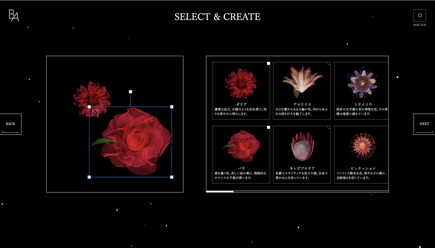 実際に花を選んでいるようなスムーズな動きを再現するために、React.jsを使用してSPA(シングルページアニメーション)でサイトを構築しました。
