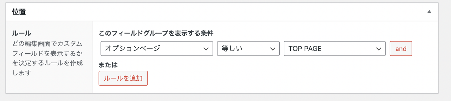 }カスタムフィールドの位置を選択時時には下記のように、オプションページを選択して、作ったPage Titleを選択します。
