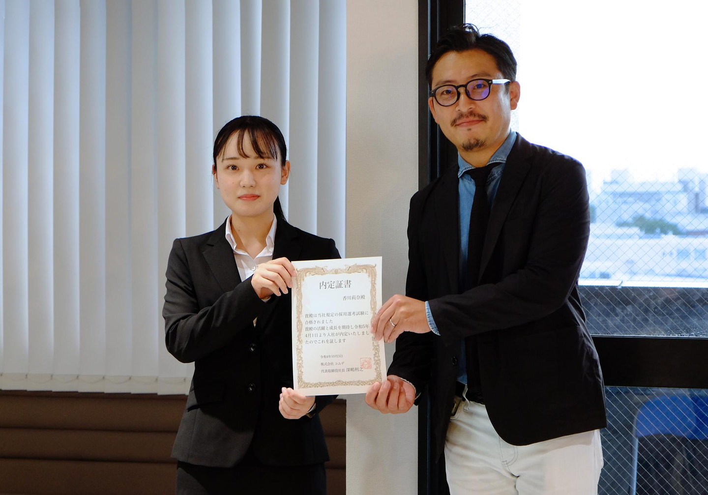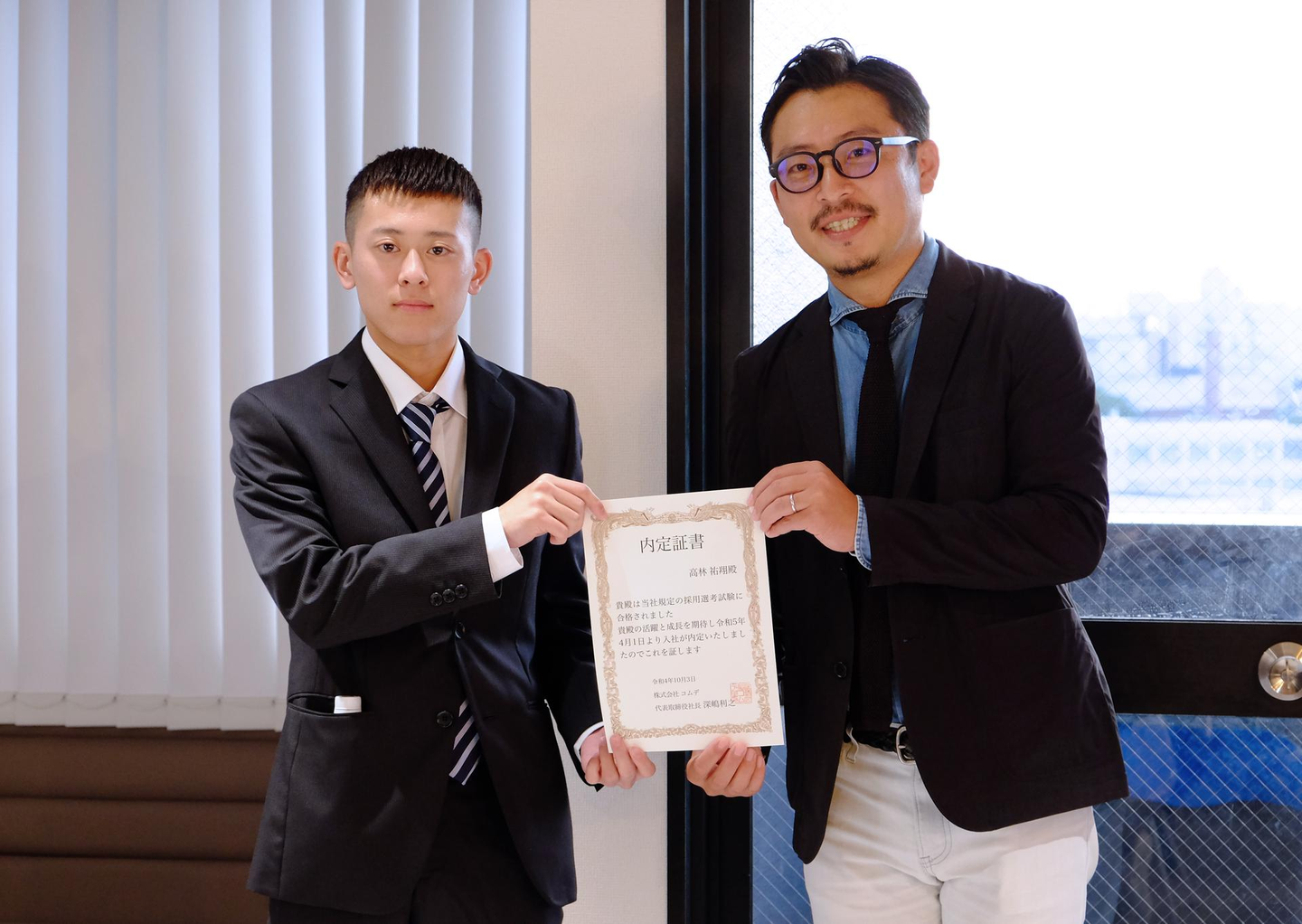 緊張の面持ちで受け取った内定証書、気持ちが引きしますね。