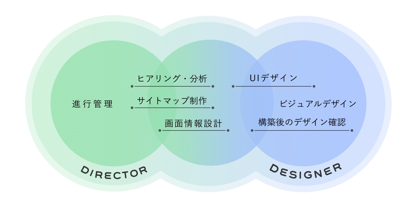 ディレクターの作業領域が広く偏ってしまうタイミングがあること、設計の部分から考える事がデザインにとっても必要であることなどを考慮し、最近では「ヒアリング・分析」「サイトマップ制作」「ワイヤーフレーム制作」に関してもデザイナーが考えるケースが少しずつ増えてきています。