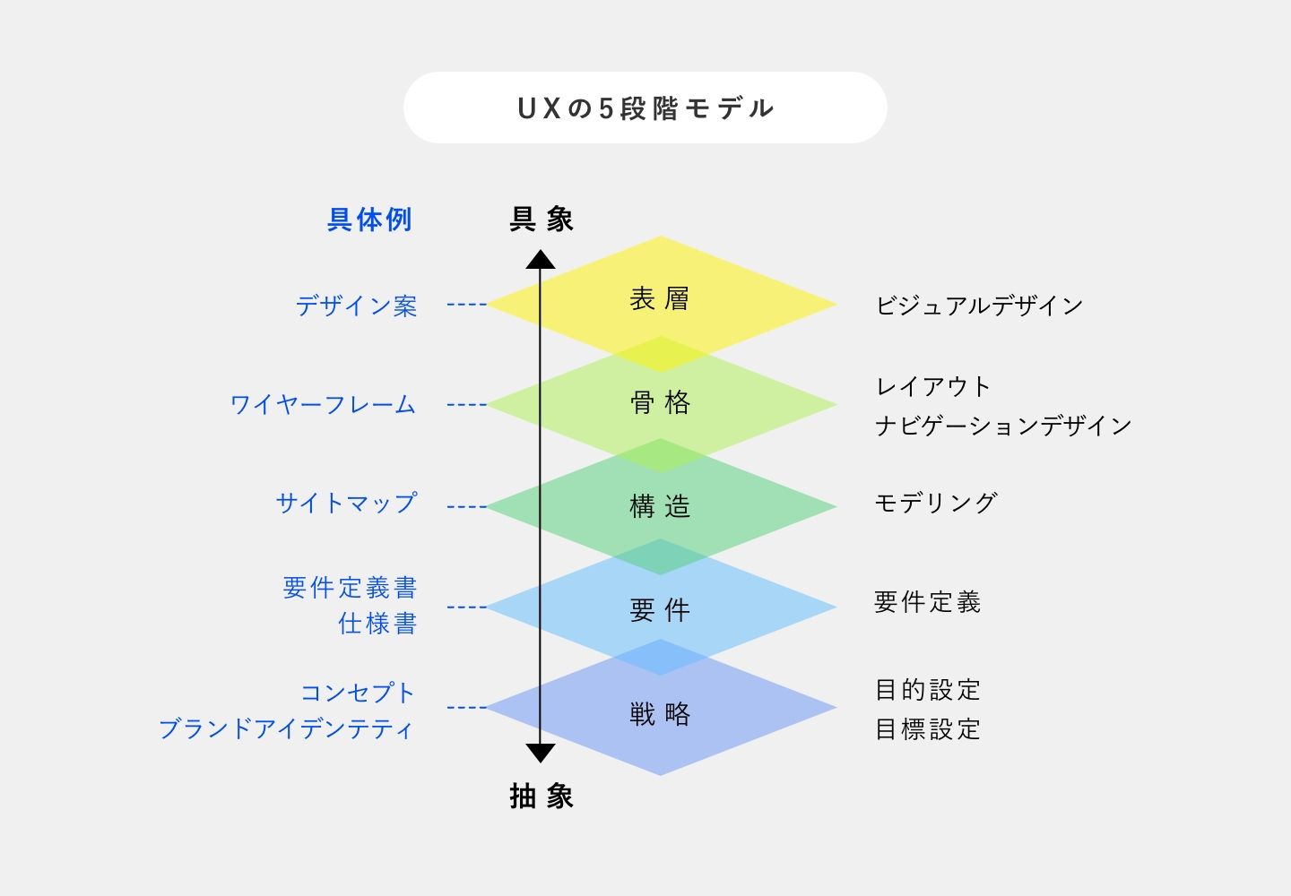 上記を踏まえて、UXの5段階モデルについて少し触れさせていただきます。先に上げた「ヒアリング・分析」「サイトマップ制作」「ワイヤーフレーム制作」は下記工程にあるUXを実現するためのステップで、以下が図解になります。目にされたことがある方もいらっしゃるかもしれません。