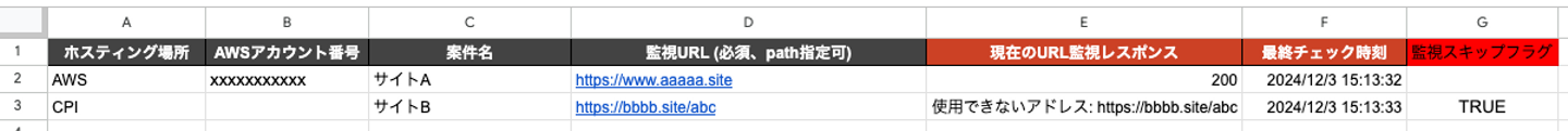 - 同じエラーが連続して通知されるのは煩わしいので1回エラーを検出した時点で、監視をスキップするフラグを立てて手動解消するまではURL監視対象から外すようにします。