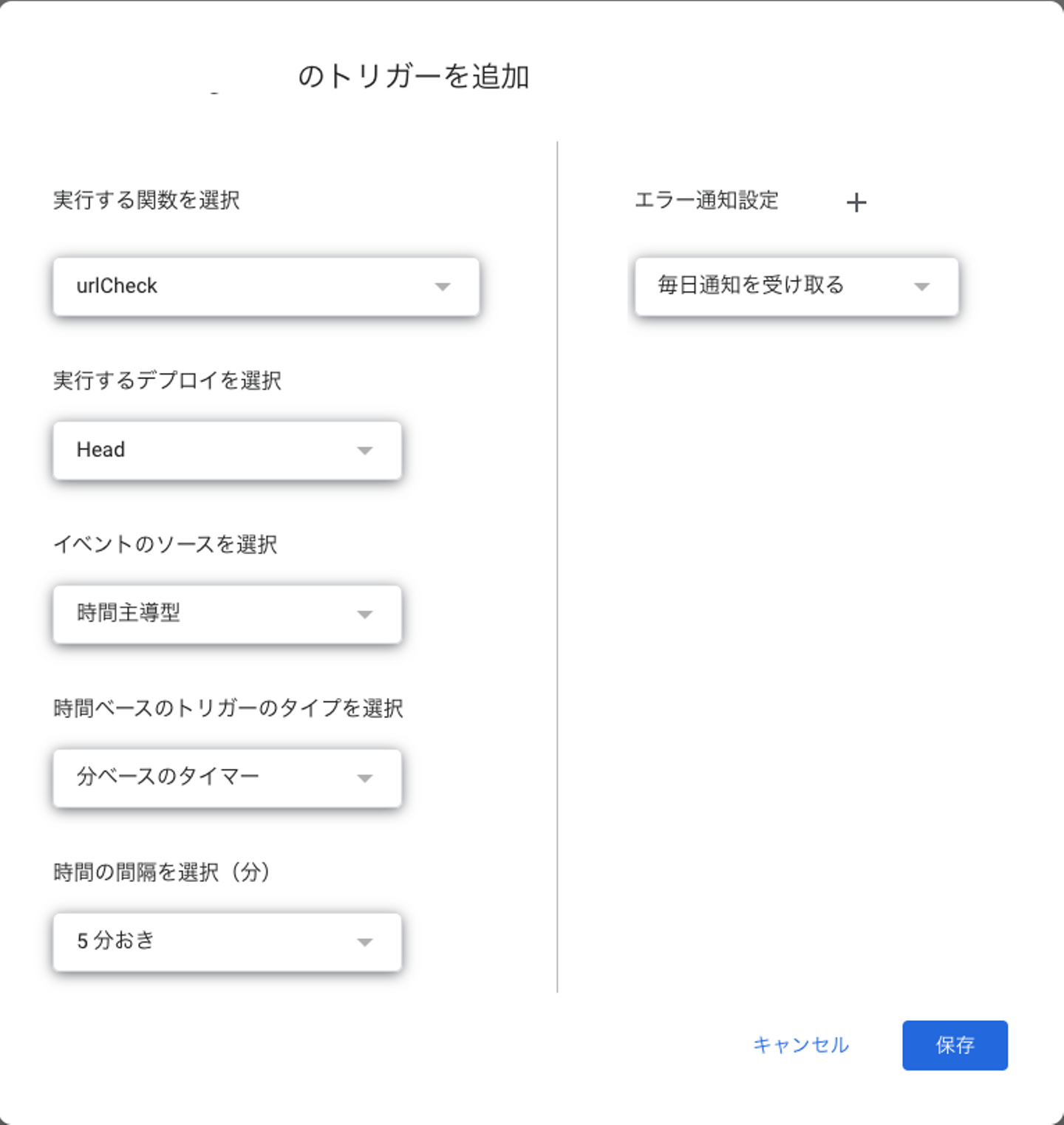 あとは以下の図のように設定すると5分ごとにurlCheck関数が実行されて、スプレッドシートが更新されます。