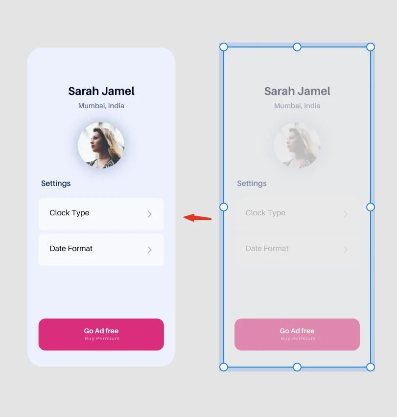 - 次に、インポートした画像を元のデザインの画面位置まで移動させ、元のデザインとピッタリ重なるように同じフレーム内に配置します。