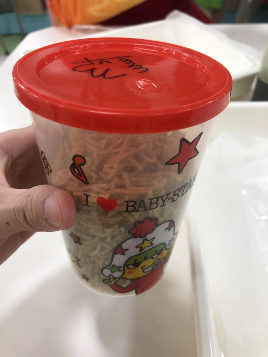 こんな感じにでっかいベビースターを作ります。さにさんはのり塩味です。へるんさんは砂肝味がいいとスタッフさんに駄々をこねてました。あるわけないです。