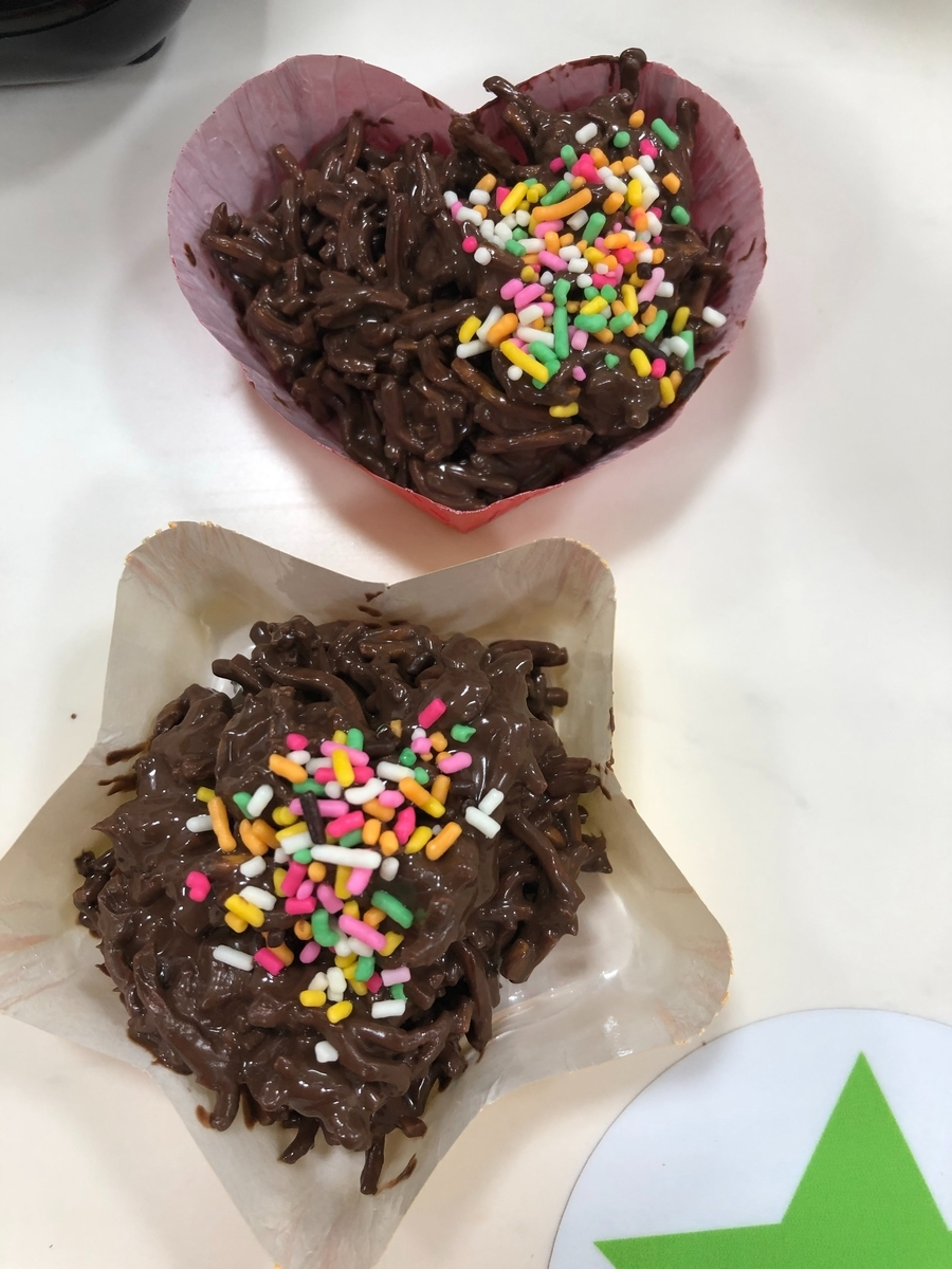 こんな感じでチョコを溶かして、ベビースターにチョコをかけてトッピングをして、冷やします。ハートの形のチョコにトッピングが半分しかないのは、ここにきているカップルへの私念です。