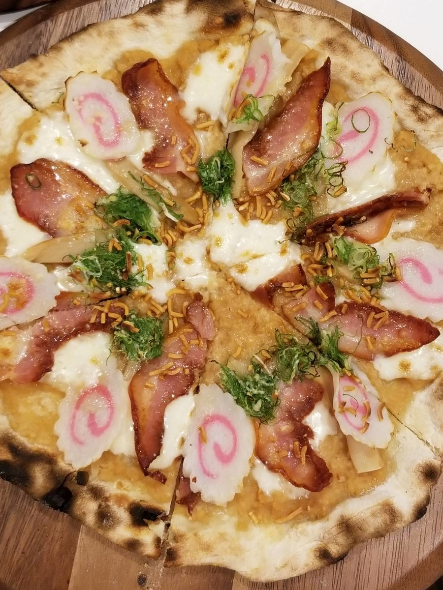こちらがラーメンピザ。ナルトまで乗っているこだわりっぷり。