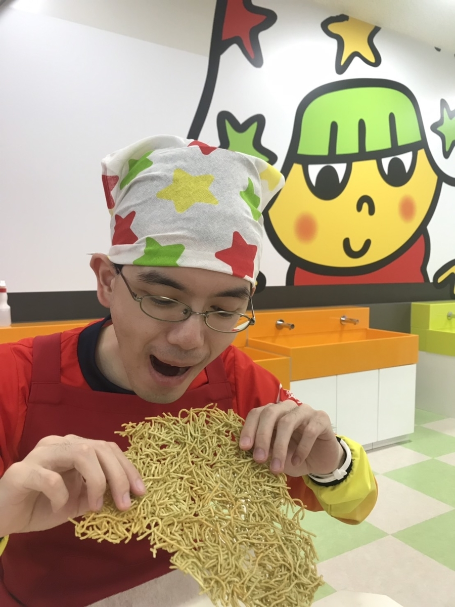 小腹も空いたところで入場時に予約していた自作ベビースターを作るという体験コーナーにやってきました。ここからはあるじ・さに・へるん、マサヤ・ぼーいんチームに分かれます。
