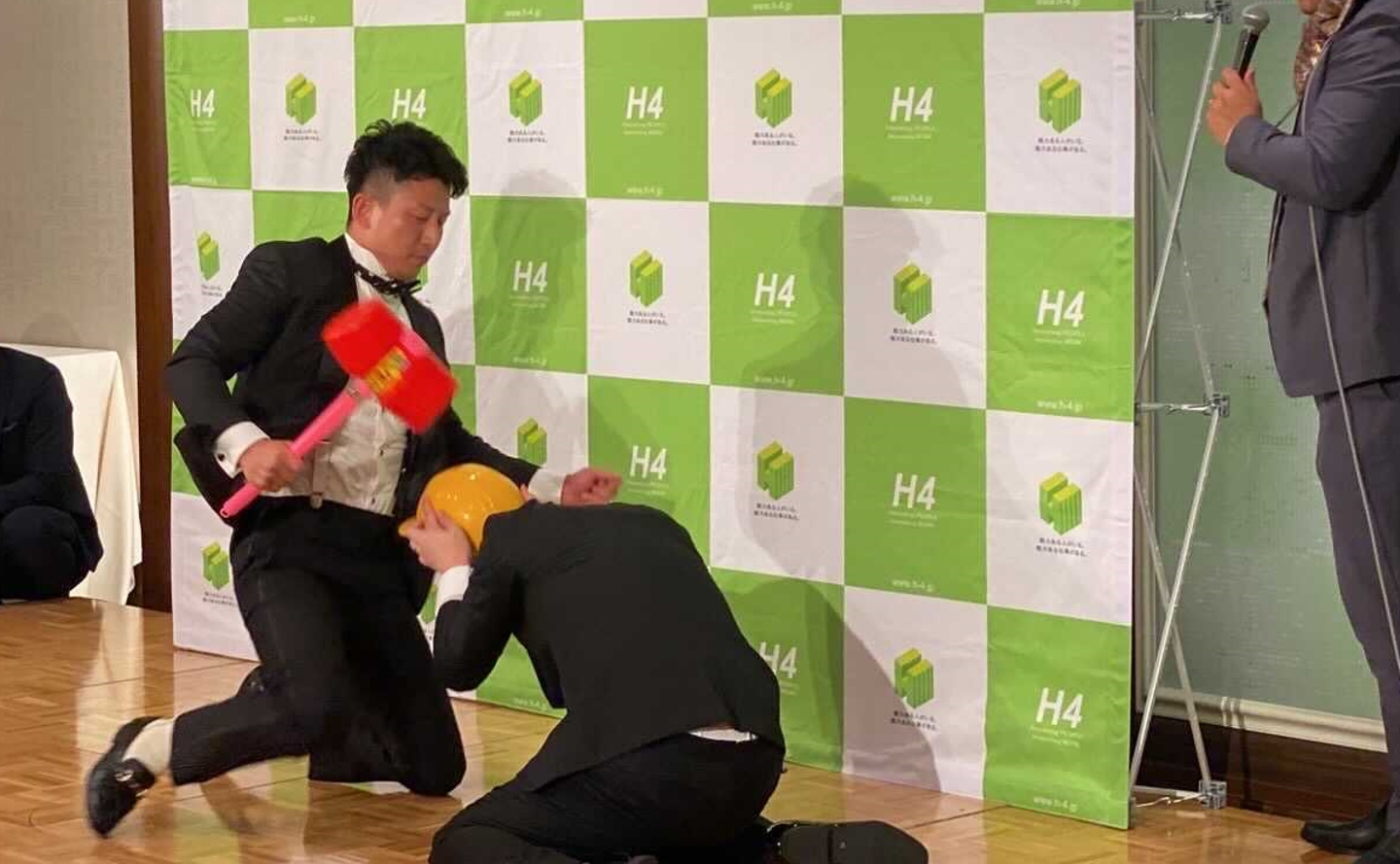いきなり社長の頭を全力で攻める山岸本部長、忖度無しにピコピコハンマーを振り抜いています。