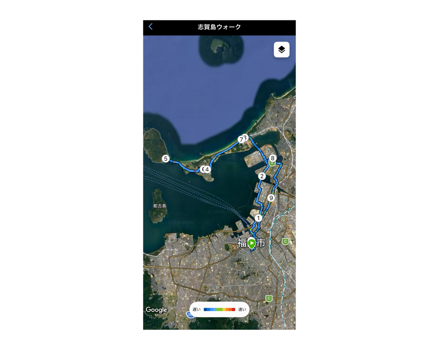 ルートは、薬院駅出発 → 志賀島到着 → 薬院駅に戻る、です。