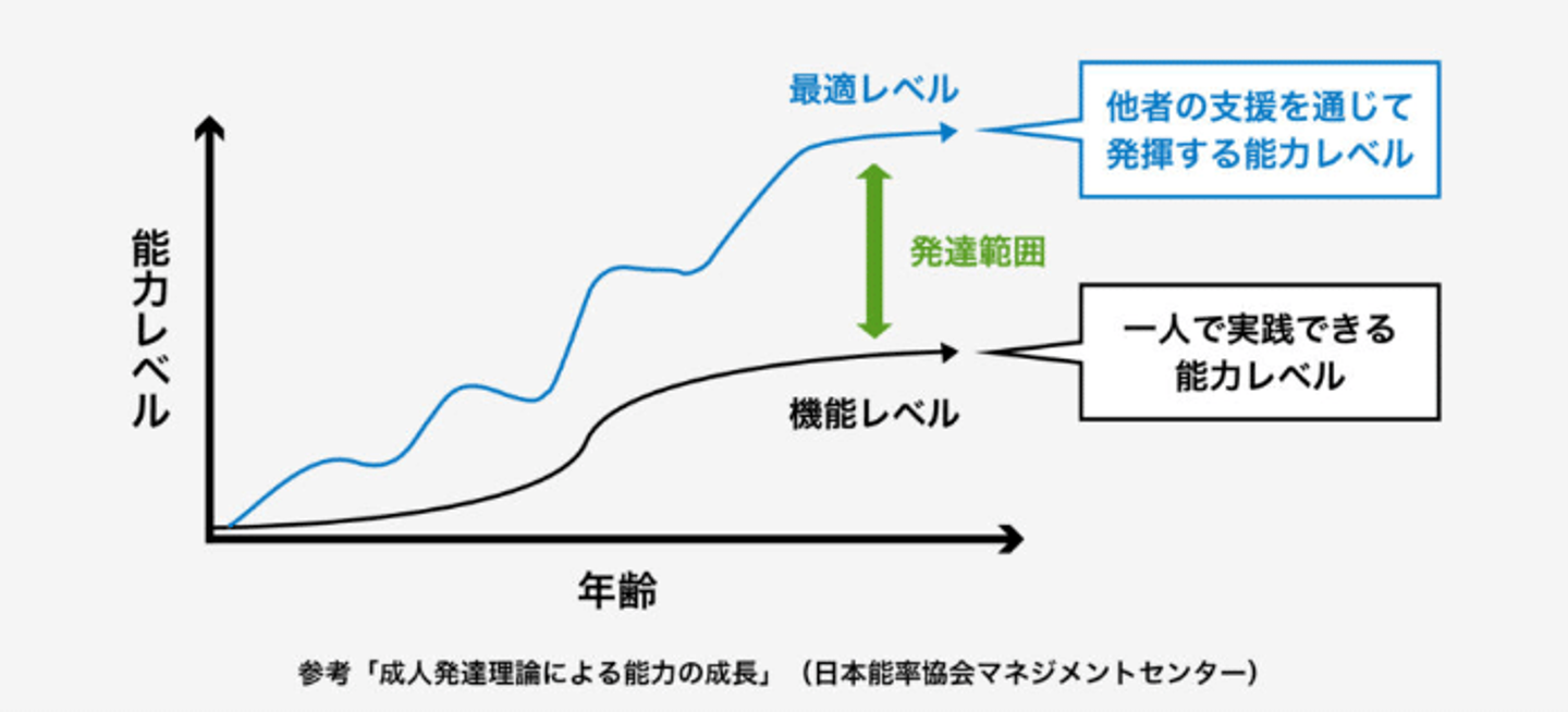 この考え方は、ハーバード大学教育大学院のカート・フィッシャーが提唱した「ダイナミックスキル理論」(※1)に基づいています。理論によると、他者の支援を受けることで、人は一人で行うよりも高いレベルの能力を発揮できるとされています。これを「最適レベル」と呼び、支援者と共に取り組むことが成長を加速させる鍵になります。