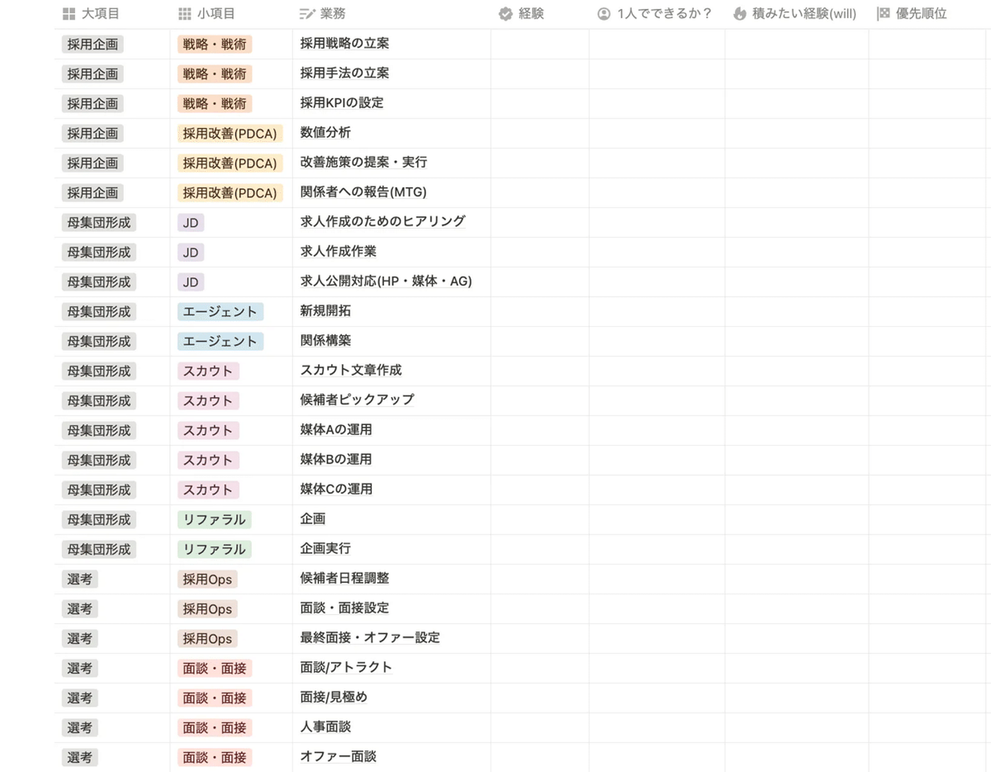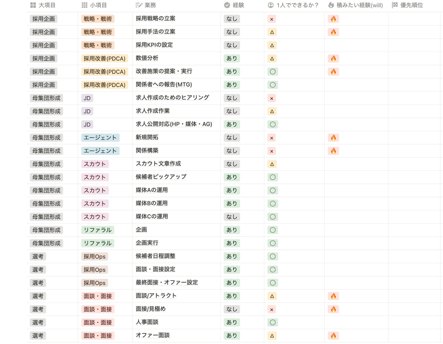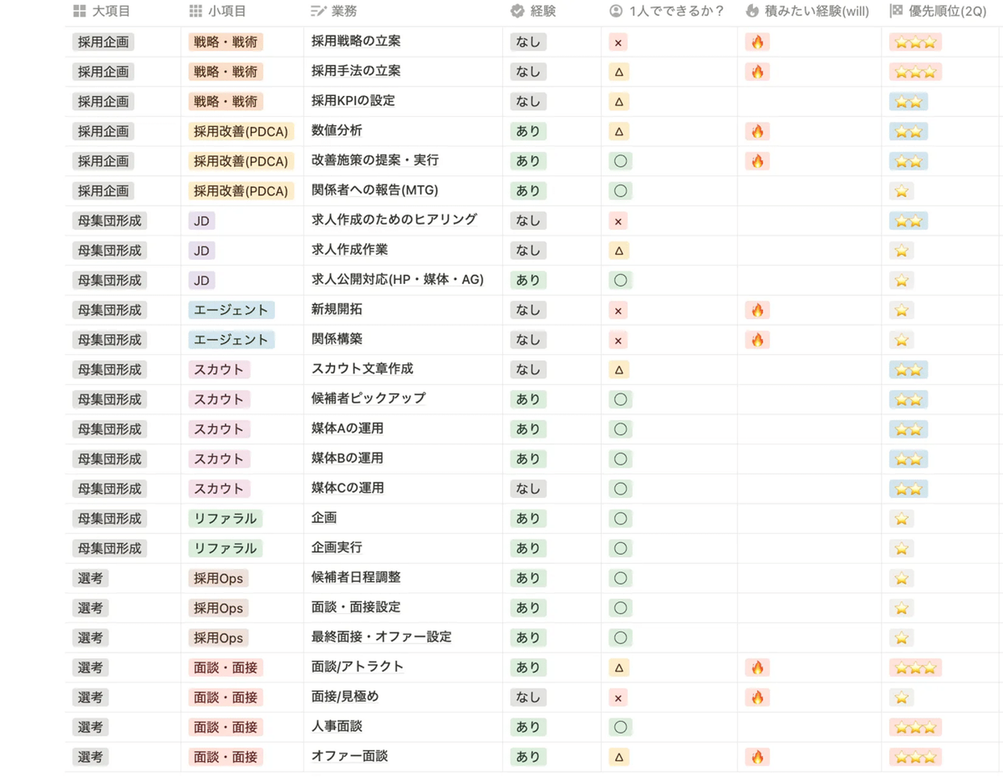 そのため、今回の採用領域を例に出すと、下記のように大きく3つのステップに分けながら経験業務の優先順位付けをおこないました。